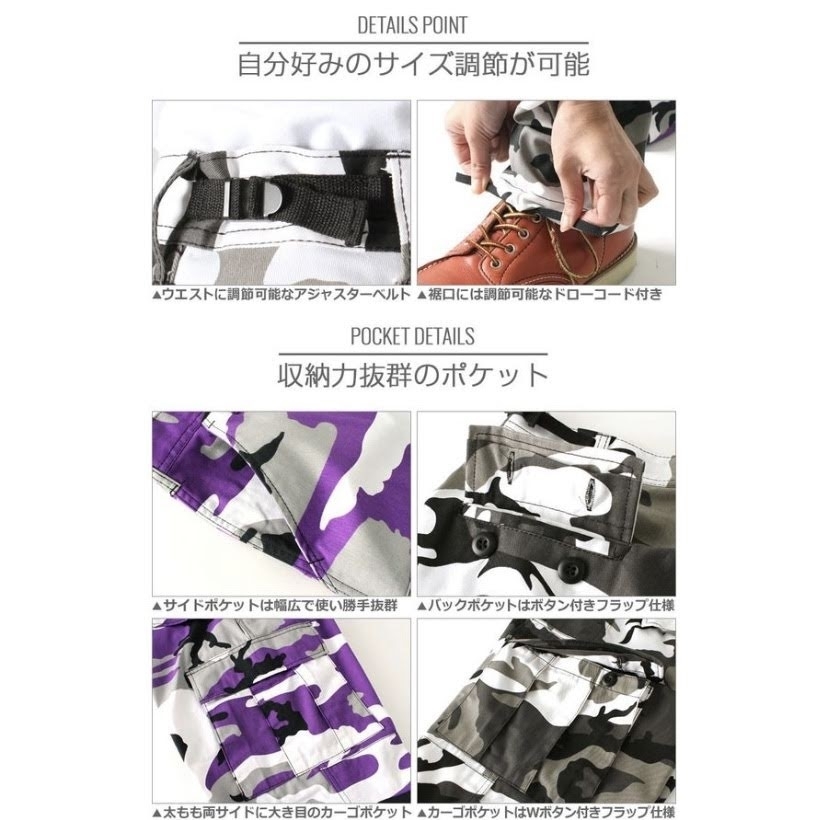 6ポケット仕様のカーゴポケットやウエスト調節の出来るアジャスター、裾口にあるサイズ調節可能なドローコードなどミリタリーブランドならではの機能が満載です。