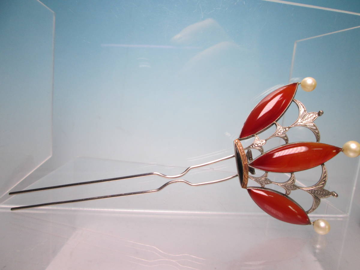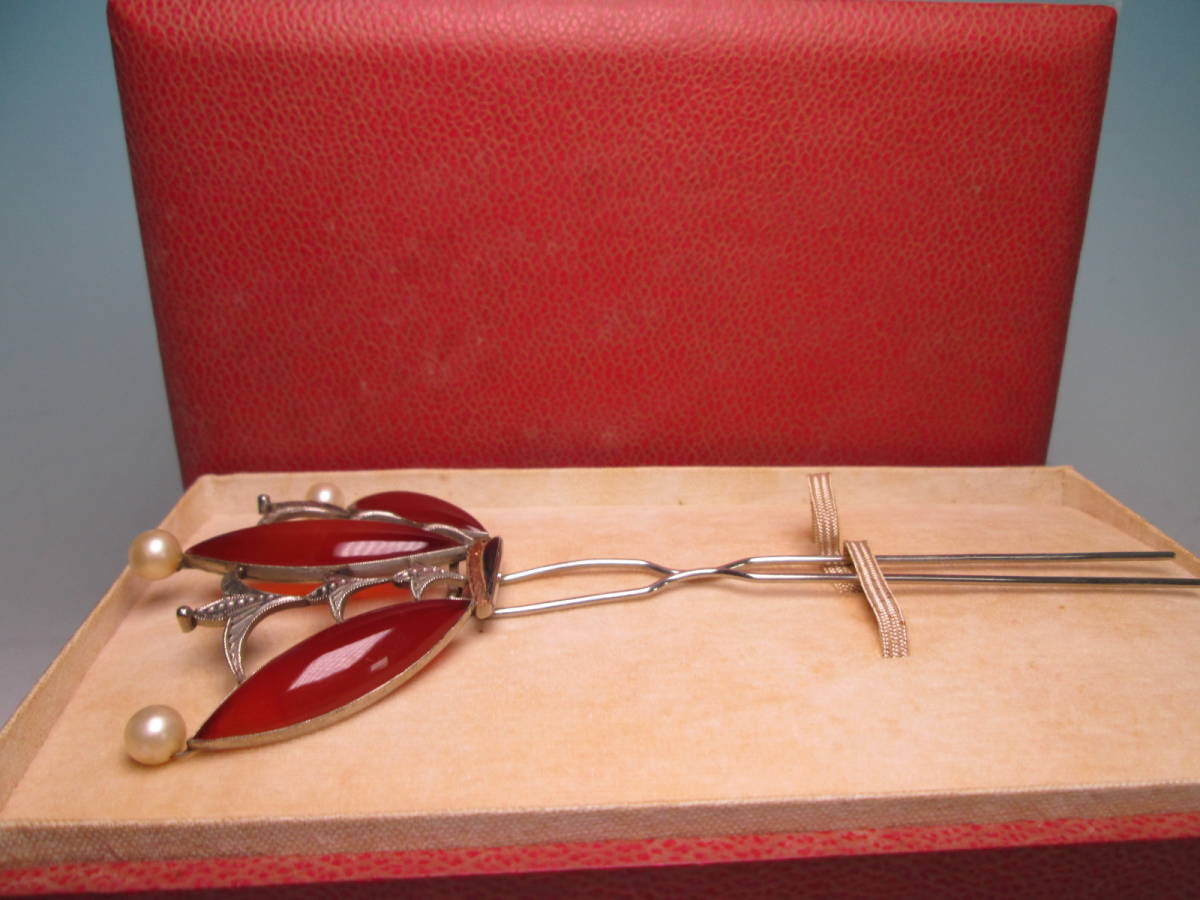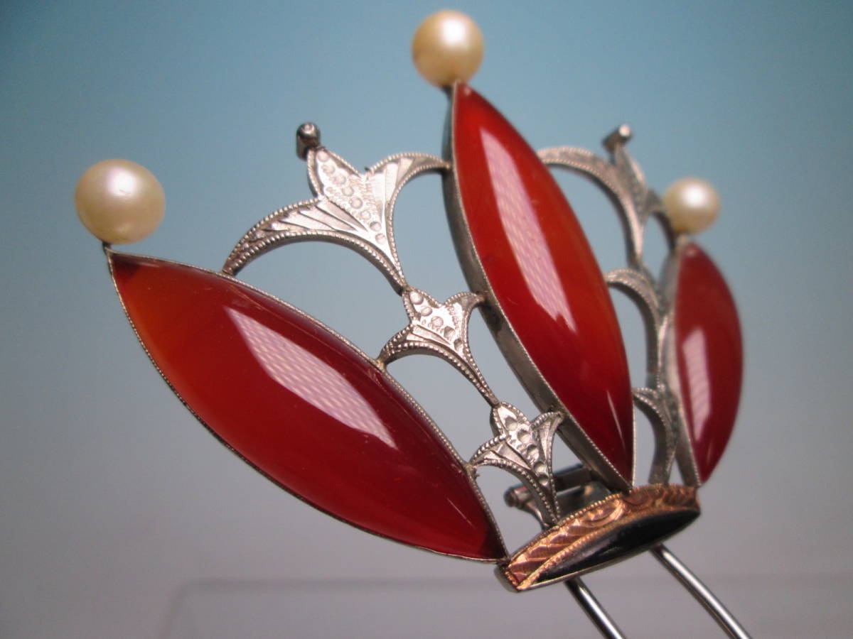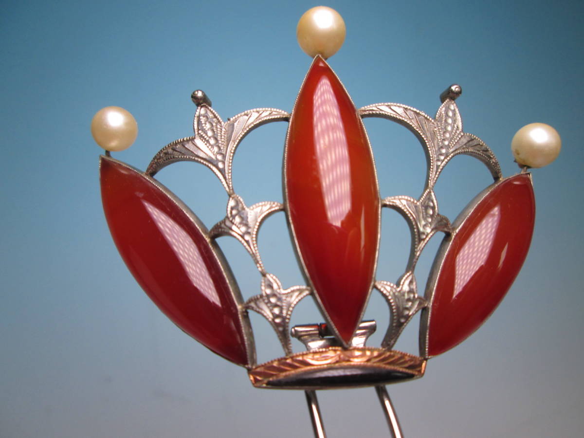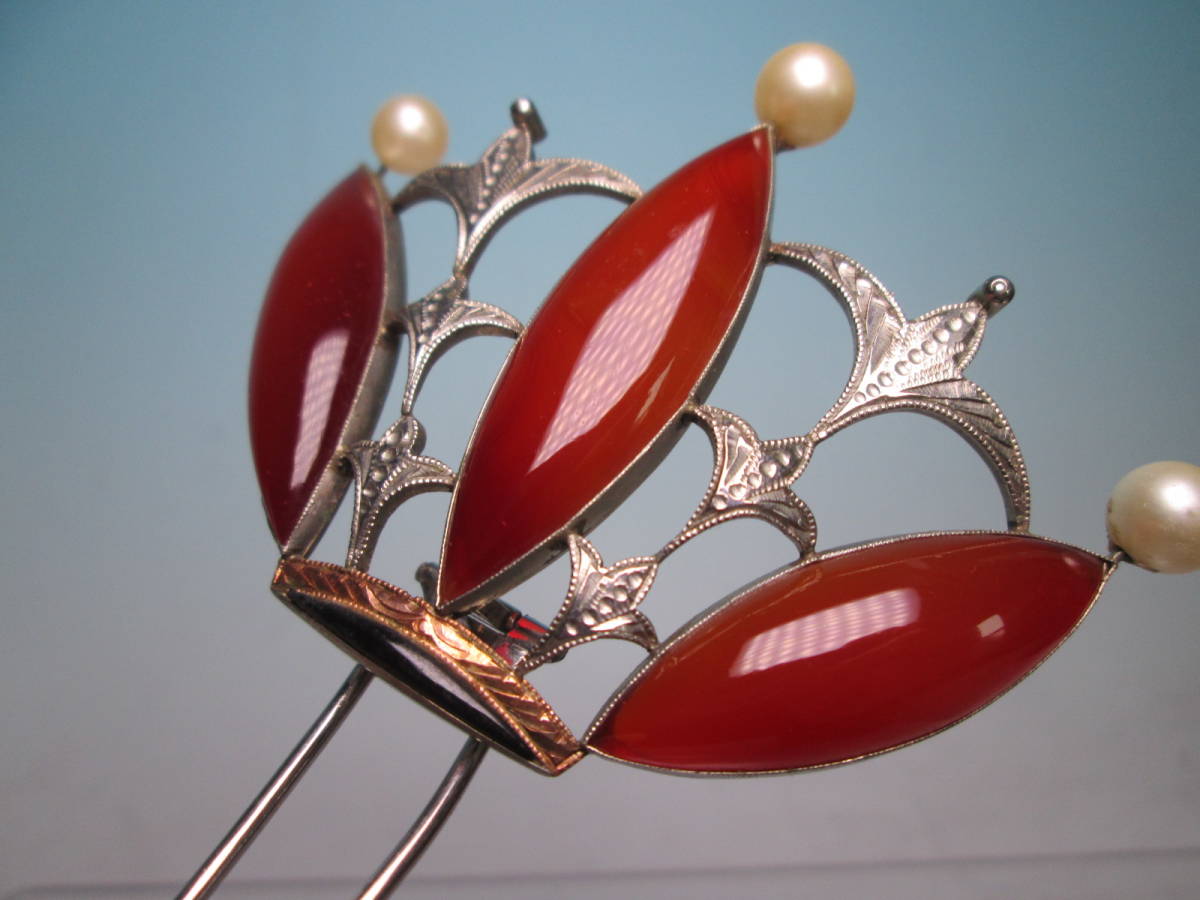 【江月】アンティーク・彫金細工 本瑪瑙/本真珠飾り 王冠のかんざし ケース付