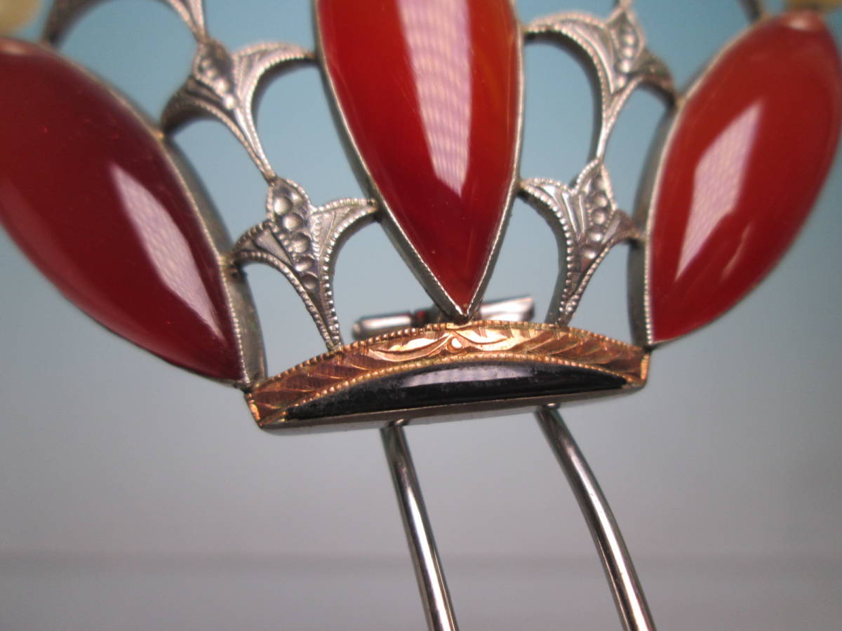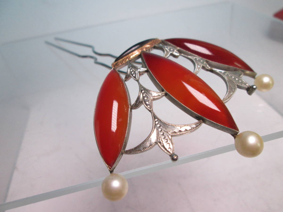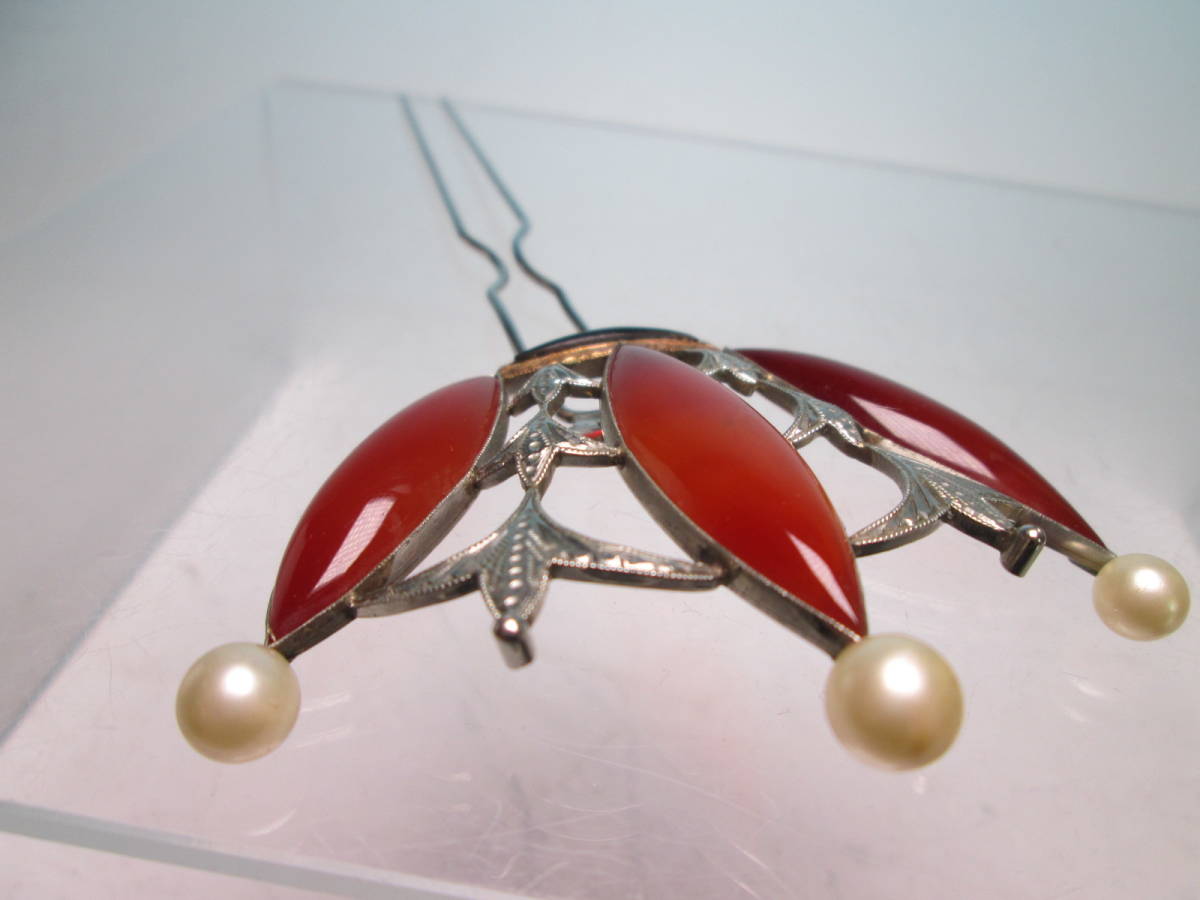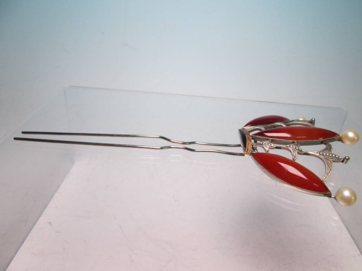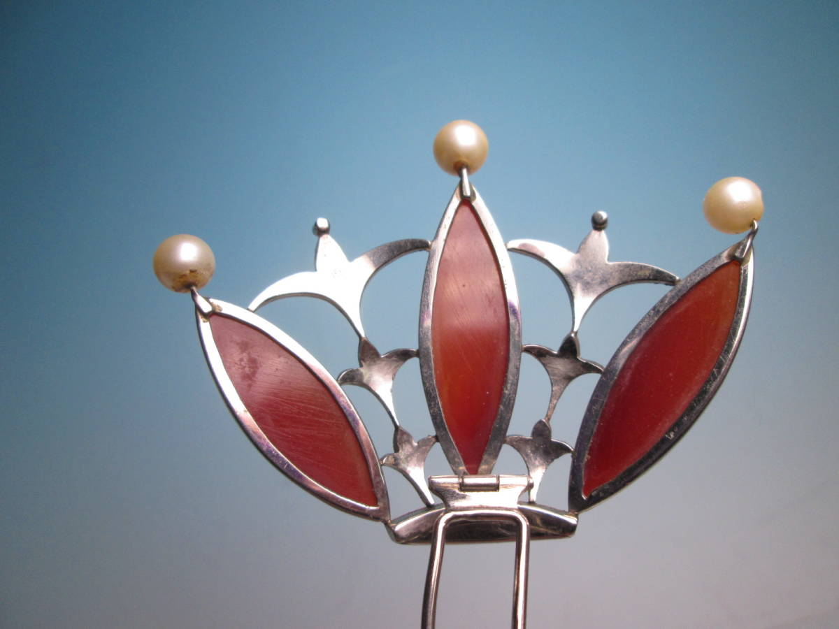 【江月】アンティーク・彫金細工 本瑪瑙/本真珠飾り 王冠のかんざし ケース付