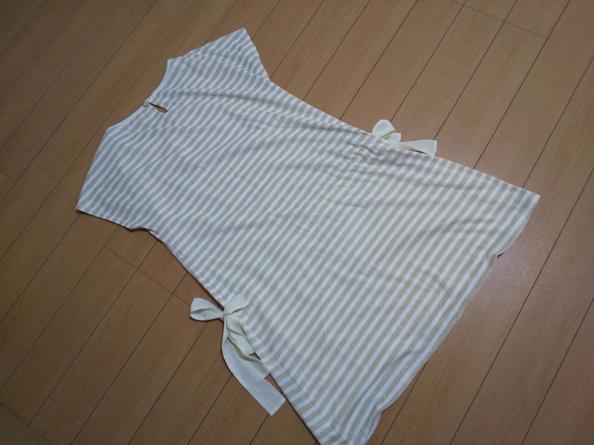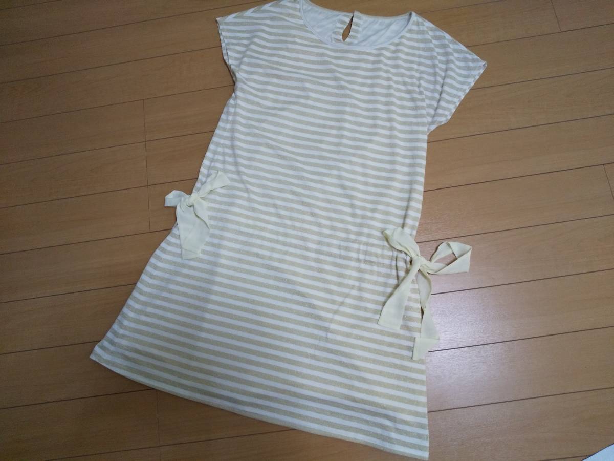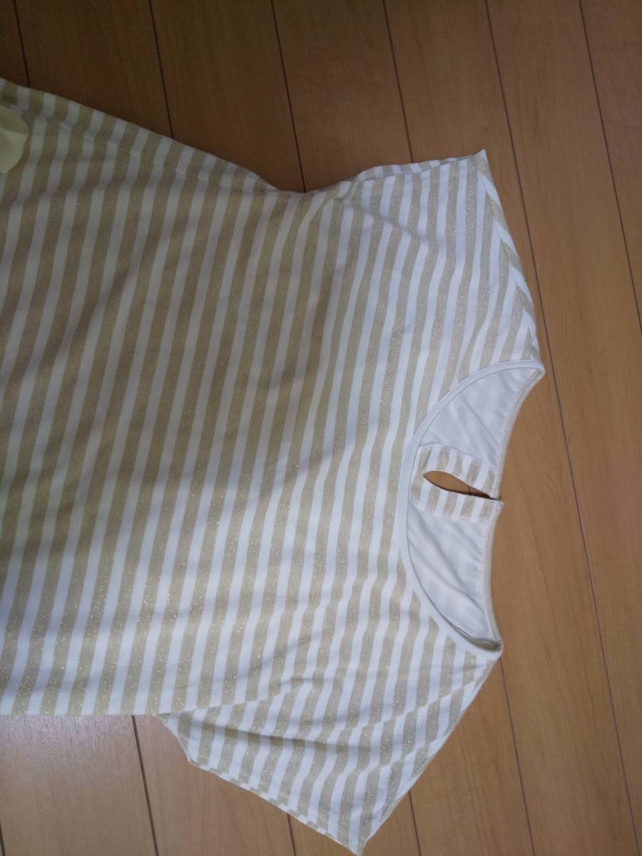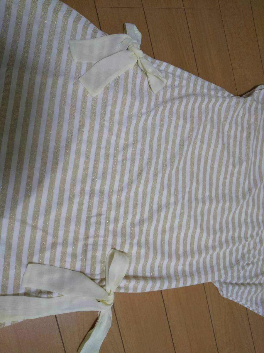 美品☆ Bou Jeloud ブージュルードで購入 着心地のいい 白×ゴールド ボーダー チュニック ロングTシャツ シフォンリボン♪LLサイズ