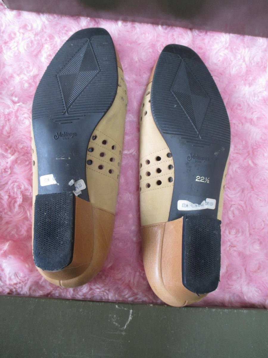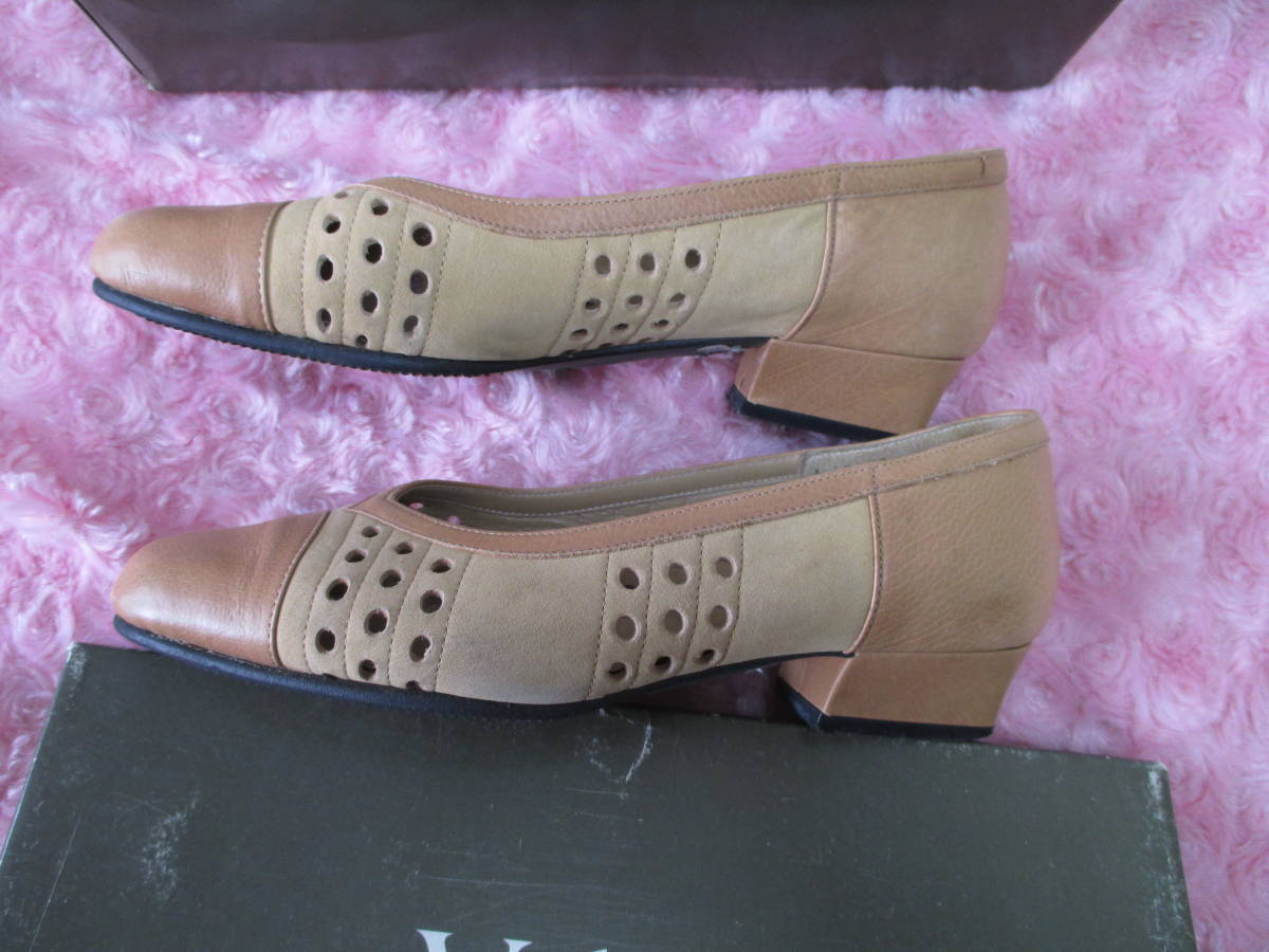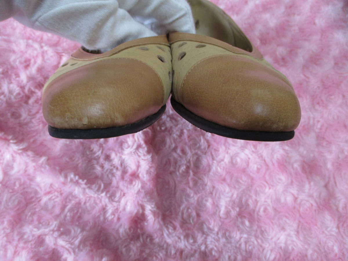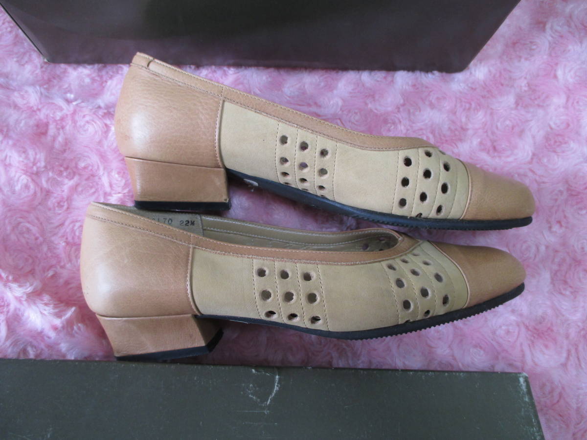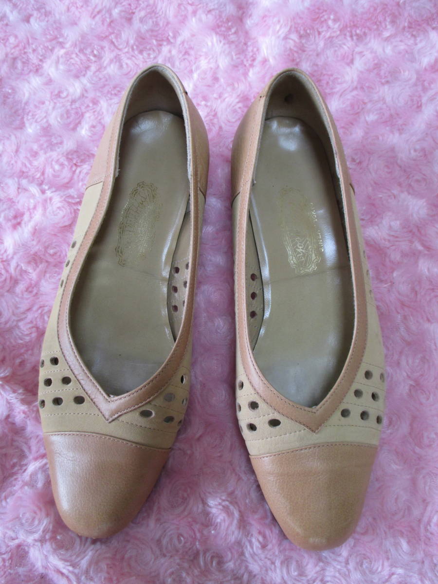 やや使用感あり 数回着用品です。中古品 ベージュ色でおしゃれな穴あきパンプス 銀座ヨシノヤ 高級感のある皮革製で、バックスキンとなめし革のコントラストです。 サイズ22.5cm 箱無し発送です。