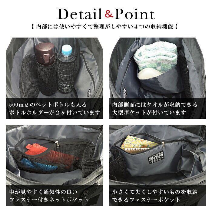本体内部 : ファスナーポケット、ファスナー付きネットポケット、ボトルホルダー(2ヶ)、大型ポケット、上下仕切りシート