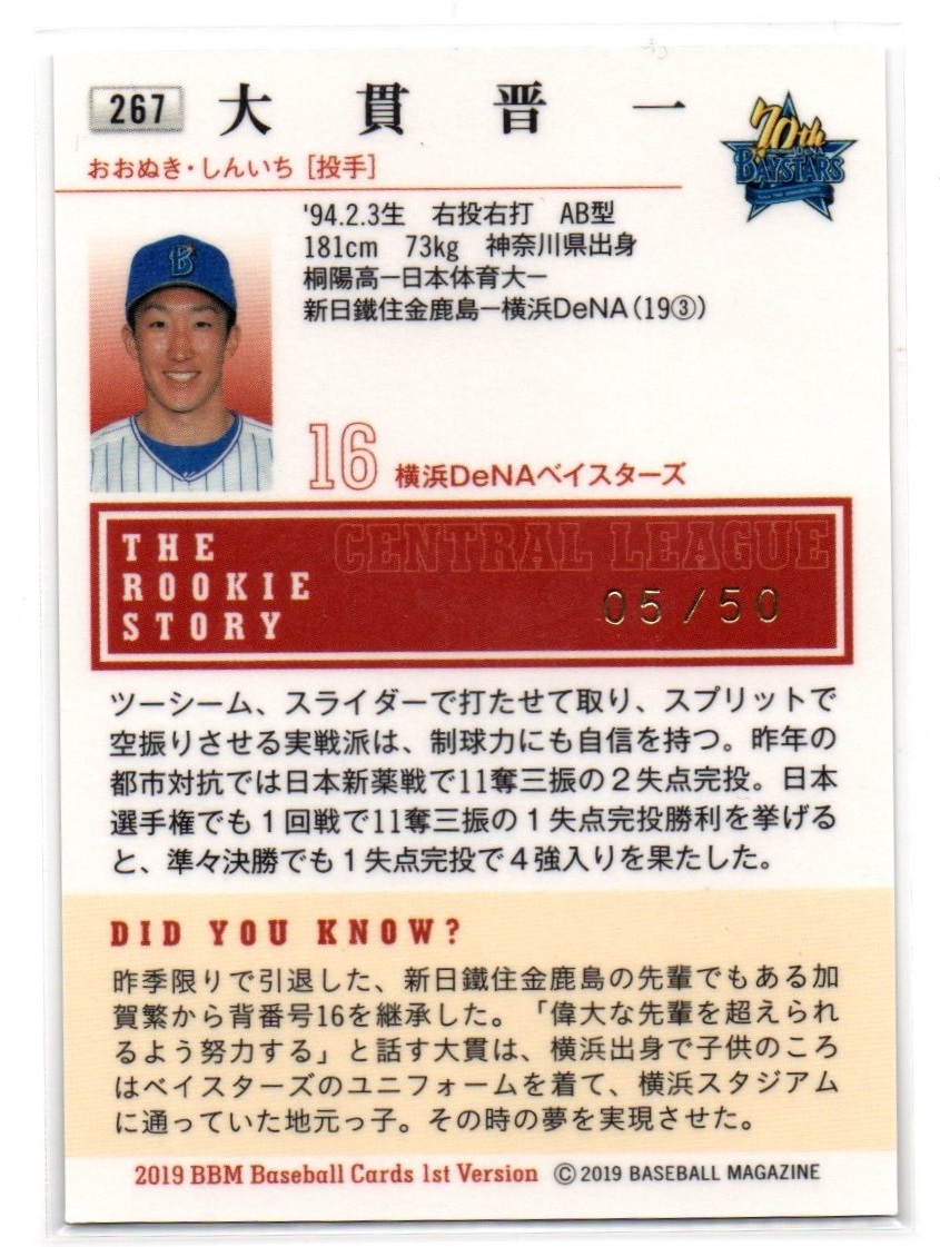 【大貫晋一(横浜DeNAベイスターズ)】2019 BBM 1st Version 箔押し版版ルーキーパラレルカード 【05/50】