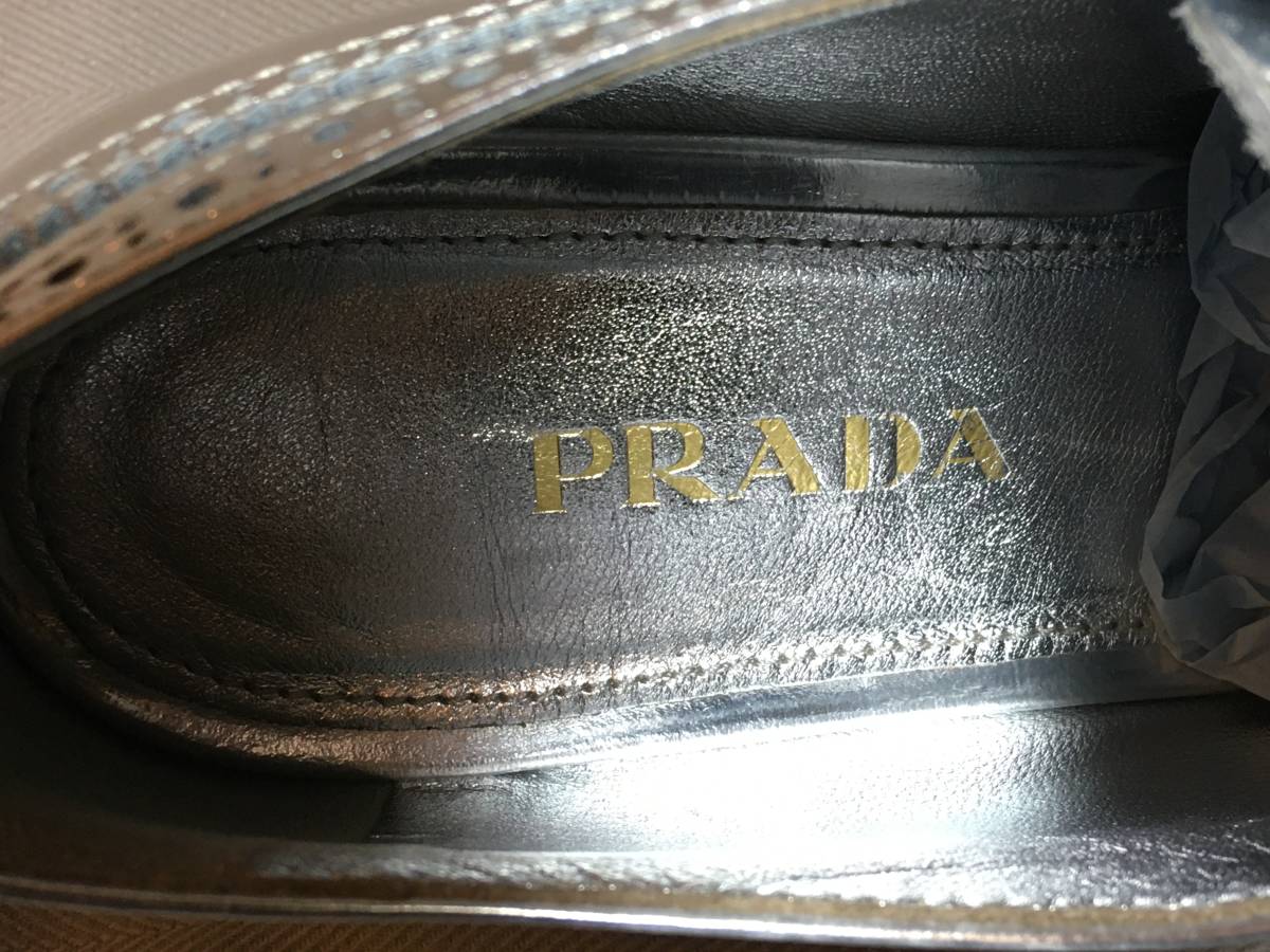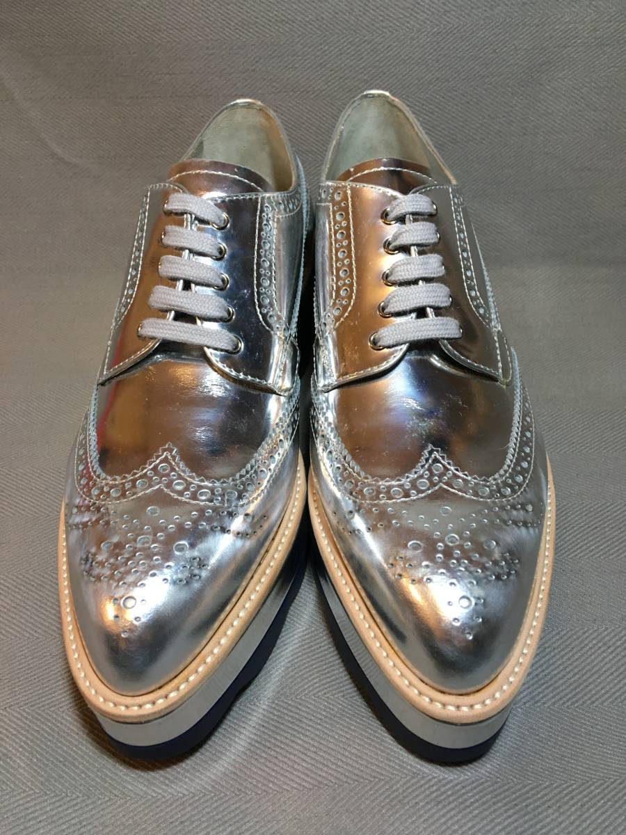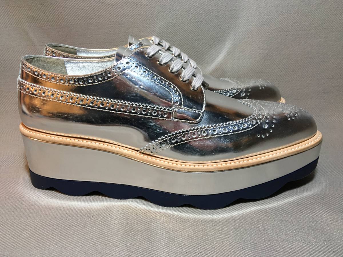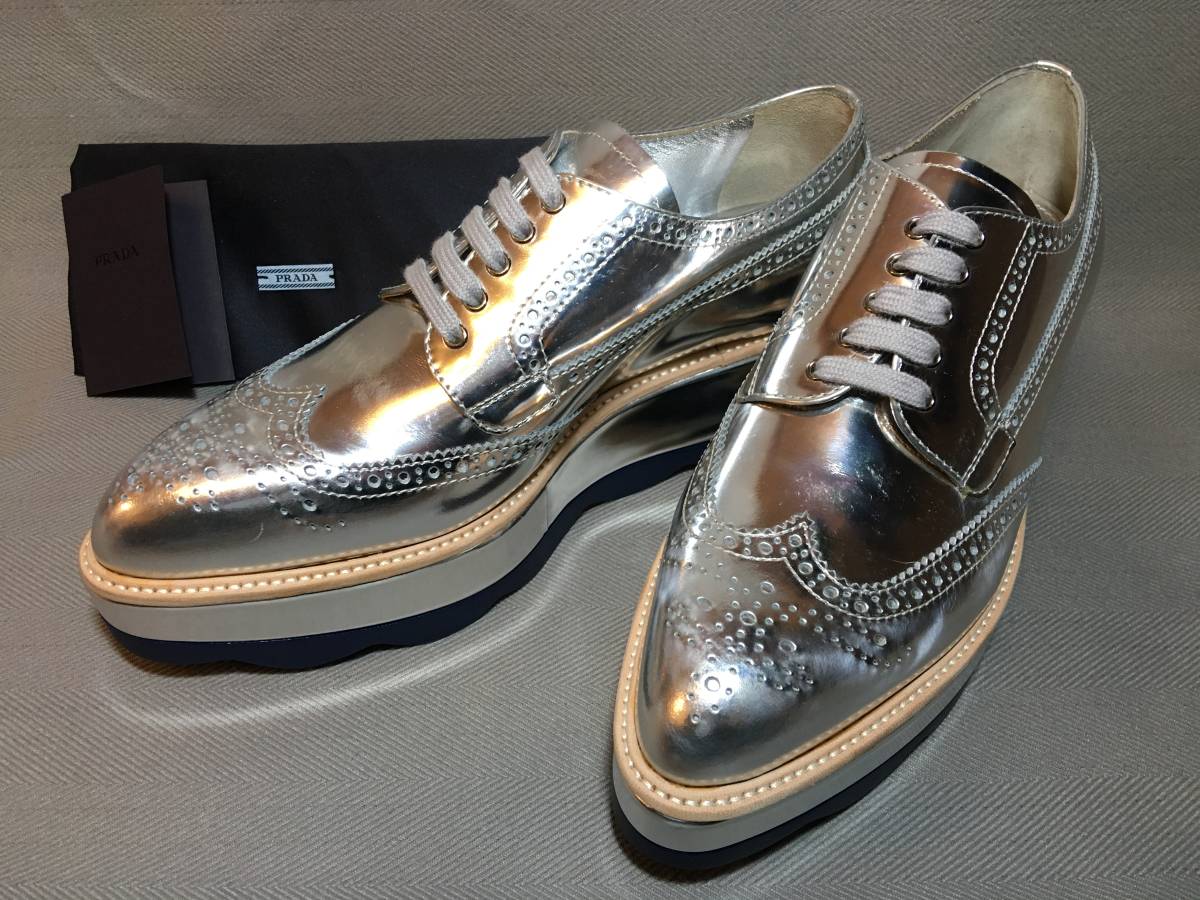 新品 本物 PRADA プラダ ウイングチップ 厚底 レザー シューズ 40 シルバー ネイビー イタリア製 ドレス シューズ 靴 革 パンプス b