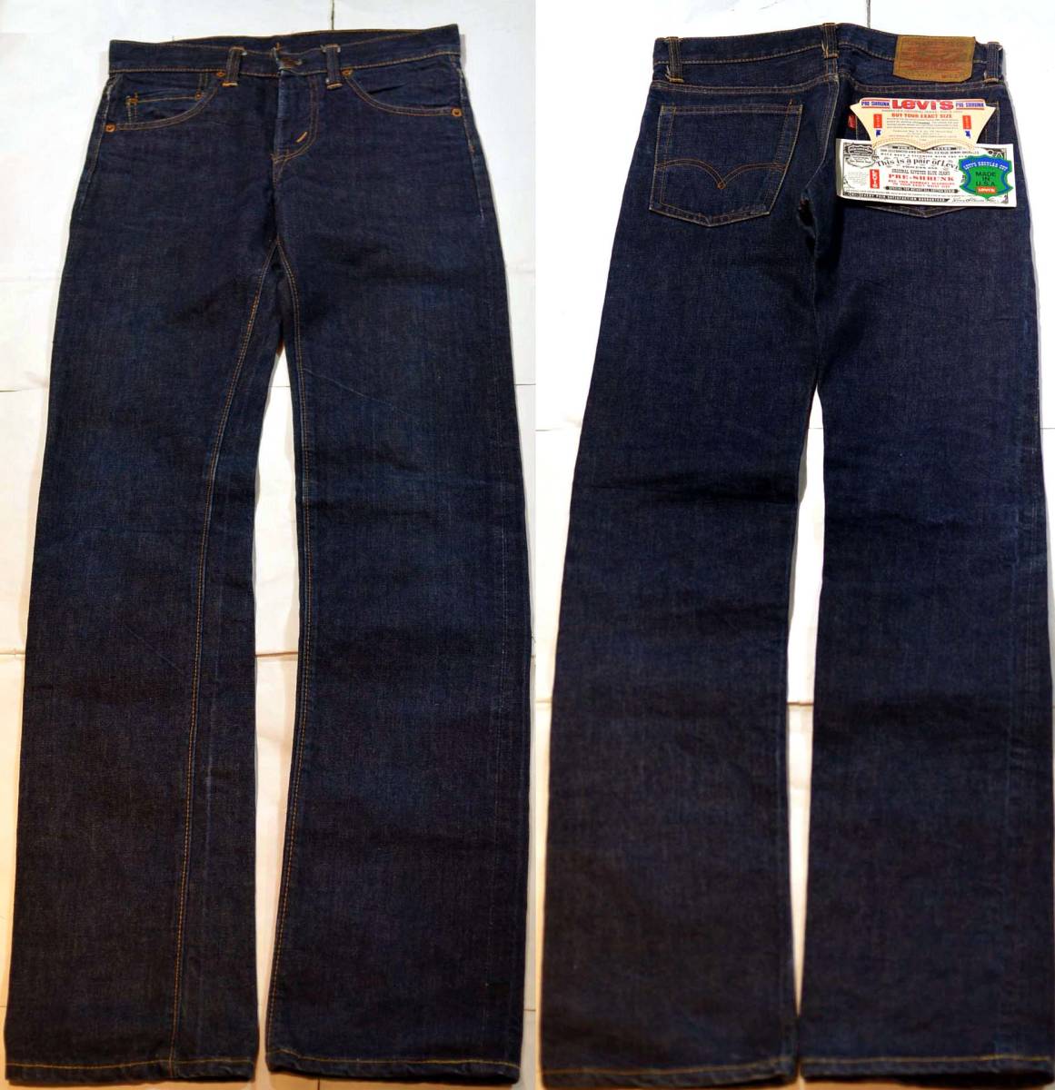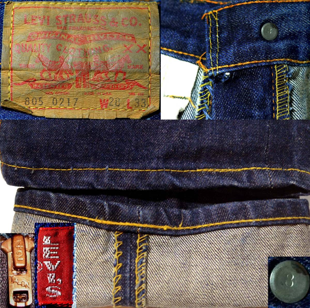60's後期の805ビッグEデッドストックです。復刻、レプリカではありません。『ディテール紹介』バックポケット裏シングルステッチ、フロントボタン裏の刻印8、タロン42ジッパー。フロントポケット、コインポケット、ベルトループ(レインボー)、 ウエスト、ジッパー、パッチ、アウトシーム、裾など、イエロー綿糸は多数使用されています。『状態』未洗い、未着用のデッドストックです。ただし、販売時点でリーバイスにより 一度洗われております。多少のこすれなどありますが、ダメージは一切ありません。フラッシャー、ギャラチケも完備です。『色落ち、特徴など』非常にレアな805Eです。 ビッグE特有の非常に深みのあるドス黒い色合いで、最高の色落ちを楽しんで頂けます。☆☆☆805は製造本数が圧倒的に少なく、ほとんど出回ってませんので、聞きなれない品番かと思いますが、 大まかに言うと505のローライズ版と言った感じです(ジッパーはかなり短く、新鮮ですよ)。 詳しくない方にとってはパッチがなければ判断は難しく、 たまに古着屋で505として販売しているのを見かけます。決定的に違うのは裾にかけてテーパードしておらず、 もしお詳しい方はパイプドステムのスタプレを思い描いて頂ければ近いシルエットかと思います。ストレートタイプのブッシュパンツもこの類に入ると思います。 もちろんMADE IN USAで、生地はプリシュランク(防縮加工されている生地)です。私自身、過去数年かけて805をデッドから穿き込んだ事があるのですが(現在も2本目を穿き込み中です)、 ローライズの分、腰が締まっていますのでヒゲが入りやすく、とても良い色落ちになりました。生地は505と同じですので、色合いも深みが出ます。独特のシルエットでかっこよく、非常に≪レア≫だと思います。