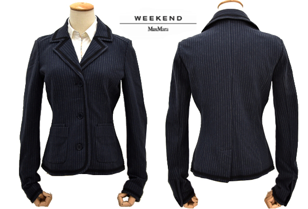 L-1327★送料無料★美品★WEEKEND MaxMara マックスマーラ★ネイビー紺色 ピンストライプ 襟り袖テープ使い 上品な ジャケット ブレザーM