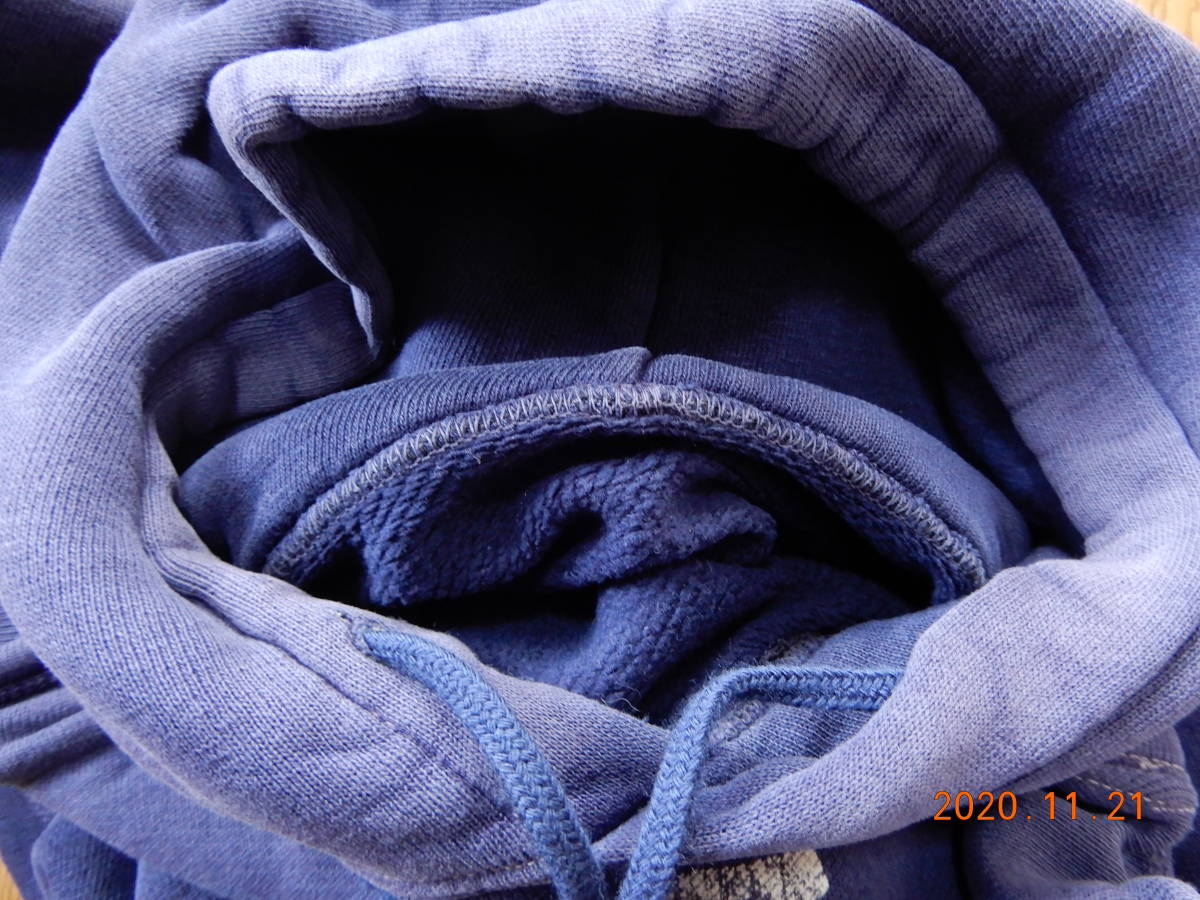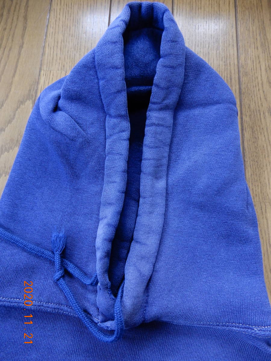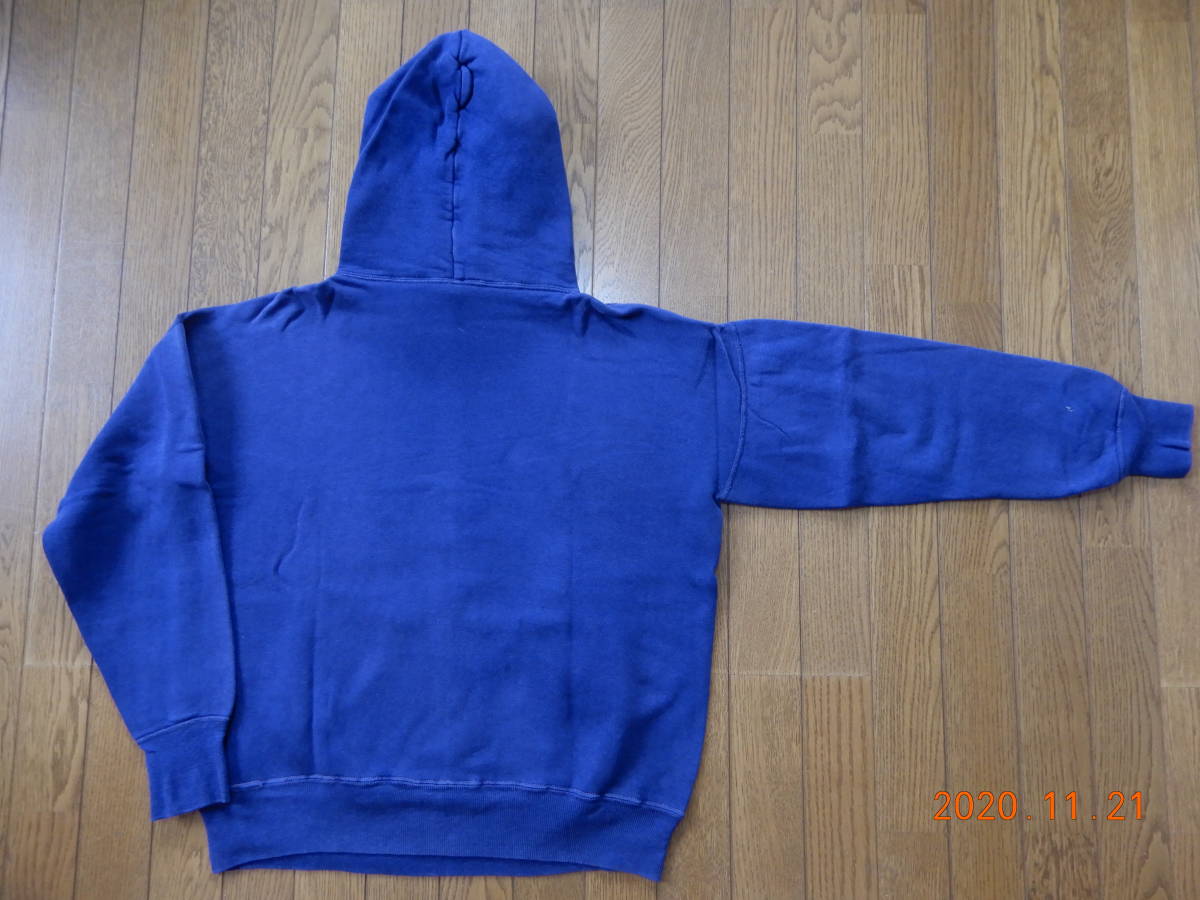 汚れ、ダメージ無く、肉厚生地で素晴らしい状態です。サイズもかなり大きく表記あればXLでしょう。ナス紺にプリントも白プリントで良し。紐が欠損していたので紐は後付けです。袖先も綺麗でここまで完璧なビンテージパーカーは今後見ないでしょう。