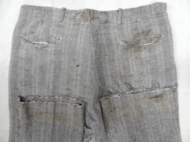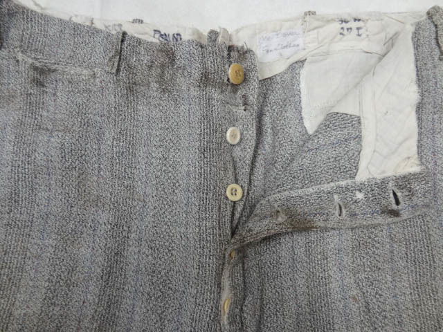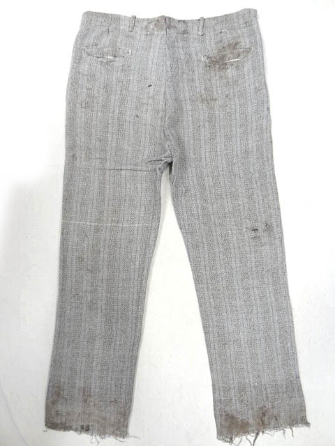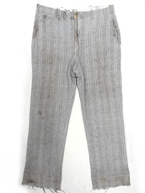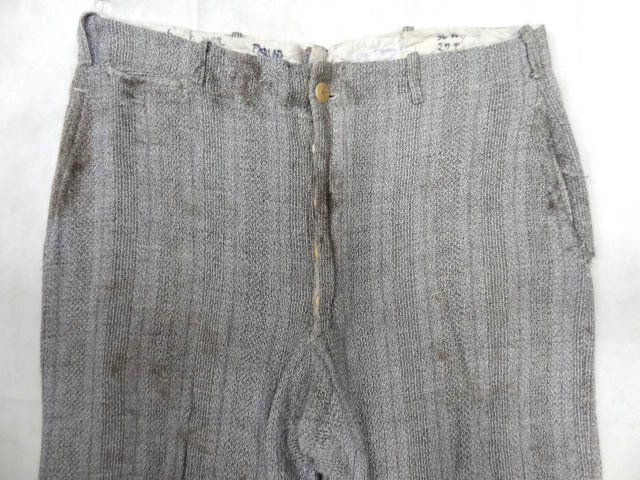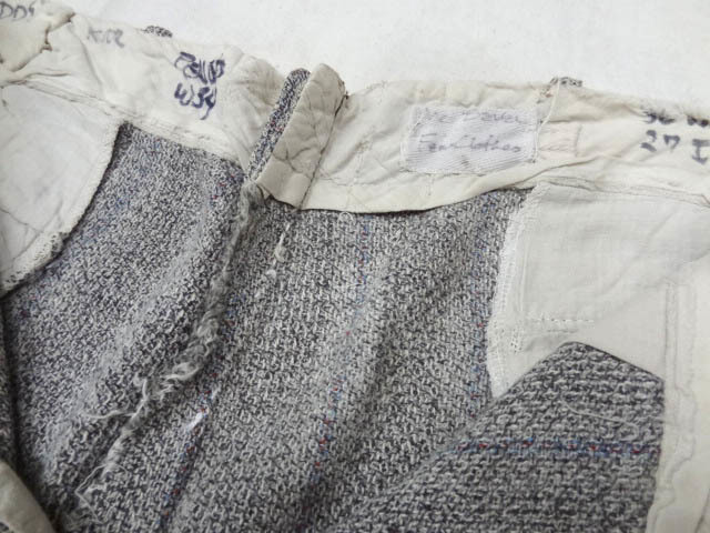 生地の特定がしにくく,印象としてはウールとリネンの混紡のような感じです。かなり履きこまれてもいるので断定しにくいですが,ヴィンテージでも断定しにくいという生地はほとんどないくらいの知識はあるので,わからないくらい珍しい生地だといえます。雰囲気もあり似たようなヴィンテージパンツも見たことがないので珍品中の珍品です
