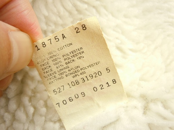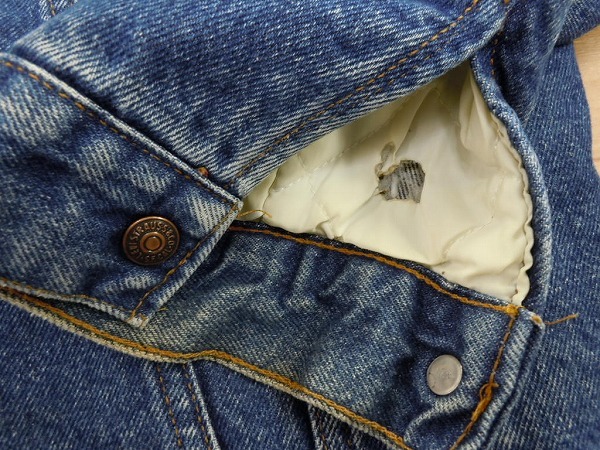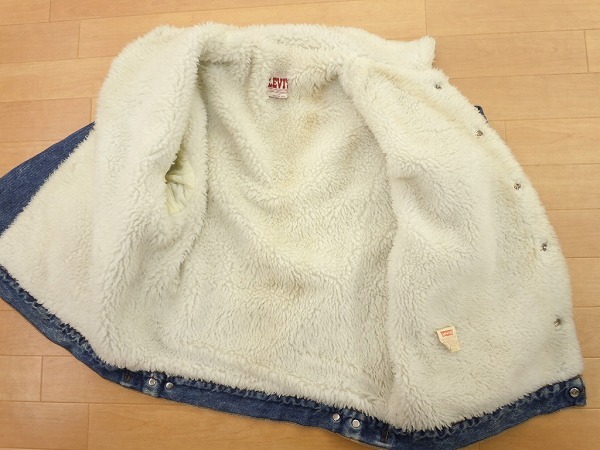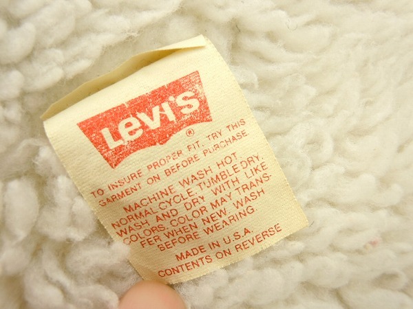 ●80s、USA製、リーバイス、ボア付きジージャンです。あくまでも古着のため、ノークレームノーリターンでお願いいたします。使用感は、ございます。裏地はボアで、袖の裏地はキルティング状です。写真のように、左袖口付近、内側に穴開きがございます。表からは見えません。ボアに黒ずみ汚れがございます。