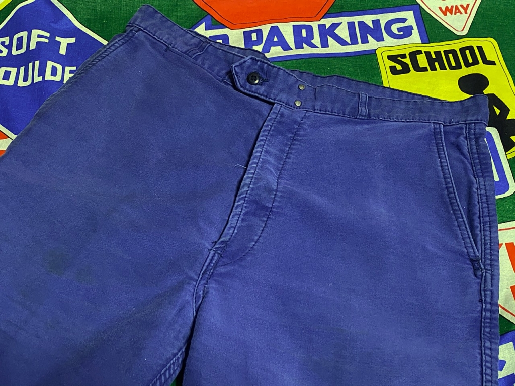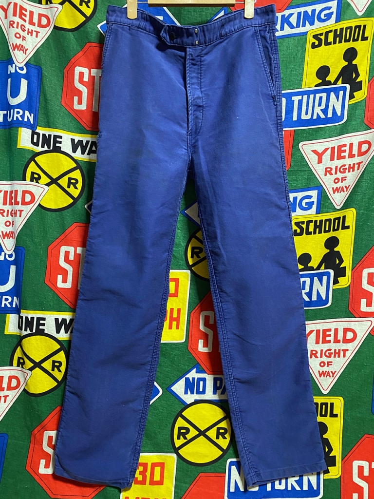 素材はモールスキン、フロントトップ部分がフックになったビンテージらしいディティールも◎な1本で、サイズ感もよく、綺麗目な感じでもお使い頂けそうなビンテージワークパンツです。