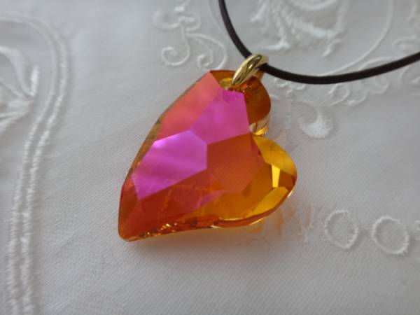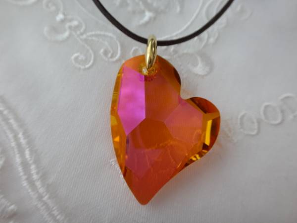 ご覧いただき、ありがとうございます。 スワロフスキーのペンダントのご紹介です。 斜めのハートのデザインです。 サイズ たて27mm よこ20mm スワロフスキーのお色 クリスタルアストラルピンク(見た目はオレンジ系のお色です。) バチカンのお色 ゴールド 革ひもの色 こげ茶 革ひもの長さ 70センチ(長さの調節ができます。) 国産本革芯入りの革ひもを使用しております。 光のあたり具合で、とても綺麗に輝きます。 スワロフスキー社製の本物を使用しております。 輝きにぱっと目を引くペンダントで、素敵ですねと評判をいただいております。 | |
