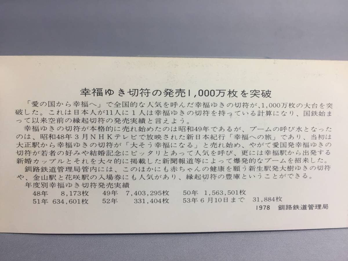 国鉄・釧路鉄道管理局 昭和53年7月10日 愛国から幸福行キップ「1000万枚発売達成記念 【K14-0040】