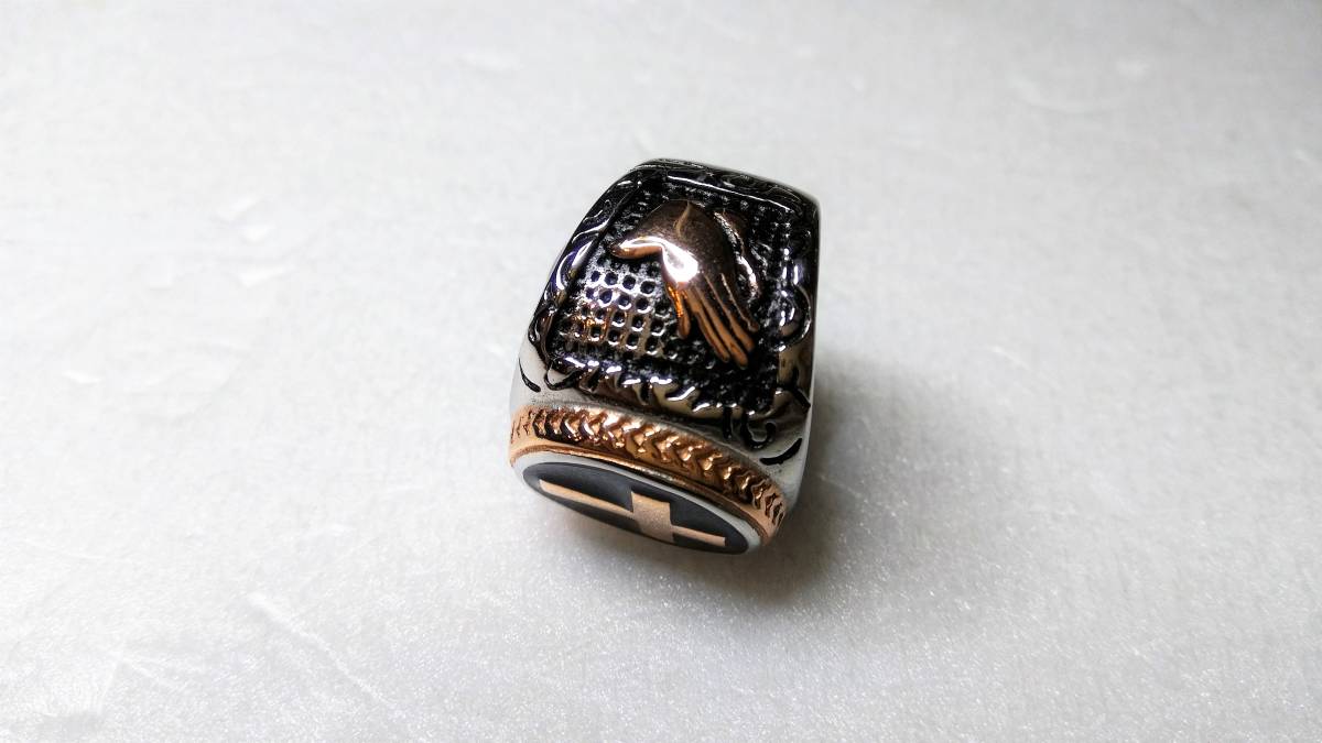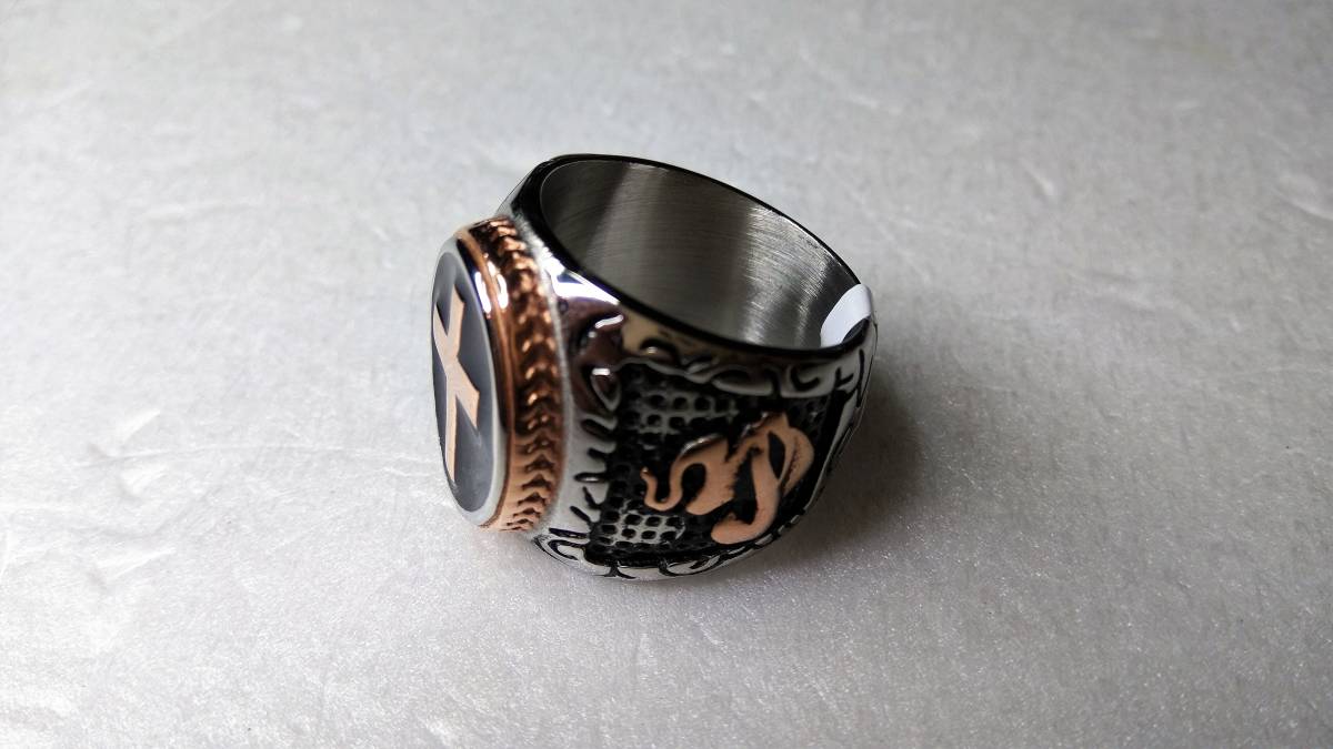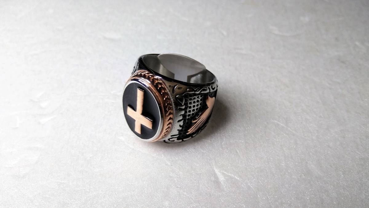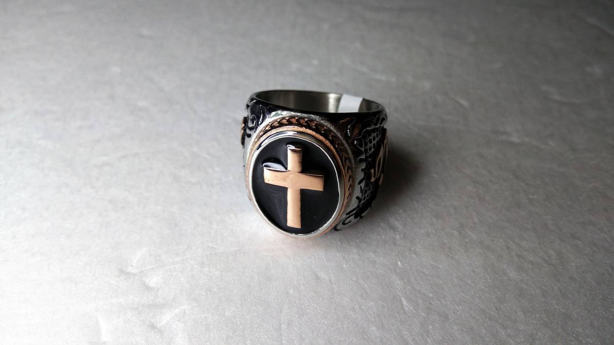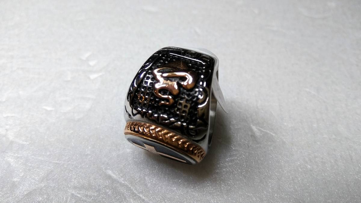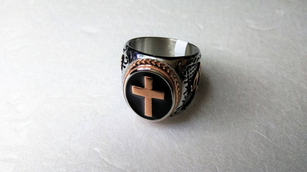 オヤッ?!必ず人目を引く、十字軍のようなリング(メッキです)になります。インパクトあるひじょうにかっこいい素晴らしいリングですので,話のネタにもなり、きっと人目を引くことでしょう。重さ:20g。サイズ:アメリカンサイズ9(リングの日本サイズ18~19くらい)素人寸ですご了承ください。新品未使用品。注)個人保管の未使用ですが保管管理上、あまり神経細かい方、細部まで気になさる方は一切ご遠慮いただきますようお願い致します。気になる方は直接ショップ等でお探しいただいてお買い求めください。ノークレーム、ノーリターンですのでよろしくお願いいたします。なお、トラブル防止のため、評価の悪い方や新規の方は入札、落札されても削除させていただきますのでご了承ください。
