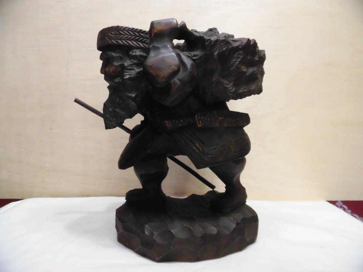 アイヌ=木彫り=アイヌが熊を背負う=北海道、銘=カムイセイクル作=カムイ民芸=旭川産、彫刻、オブジェ、東洋彫刻