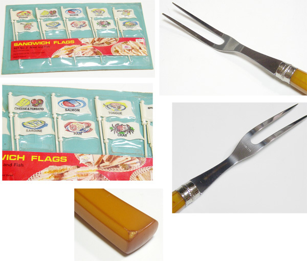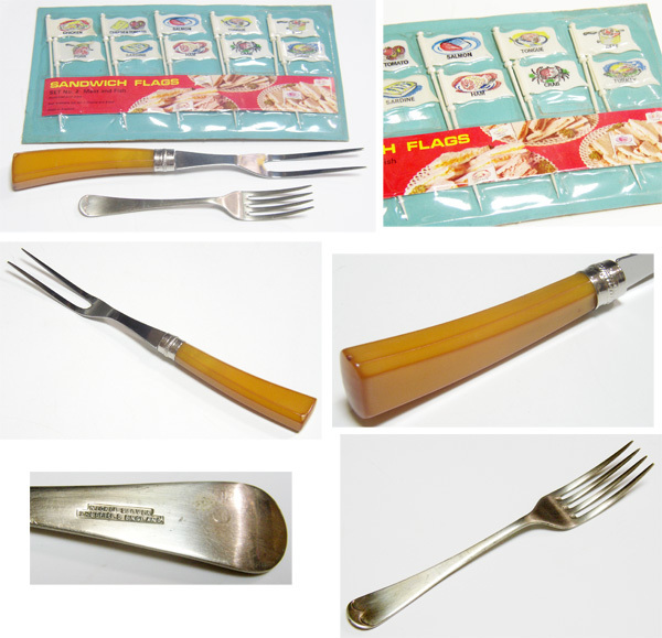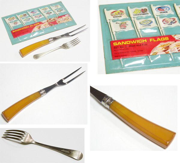 英国 ヴィンテージ FLAGS & Carving Fork セットです。状態は、古い物ですので、擦れや薄汚れと、ベークライト(持ち手)角に表面の色のはげと(画像3)、小フォークに色あせや擦り傷がありますが、ビンテージの雰囲気ある物です。イギリスで購入しました。デザインや色合いがとても可愛いです。3点セットの価格です。古い物ですので、状態はそれなりですが、年代物の風格とレトロ感ある物です。FLAGS (MADE IN ENGLAND) 台紙の縦 13.5cm、横幅24.6cm、Carving Forkの長さ 25.5cm、フォークの長さ16.5cm(裏に NICKEL SILVER SHEFFIELD ENGLANDの印があります。) ビンテージ物とご理解頂いて、ノークレーム・ノーリターンでお願い致します。