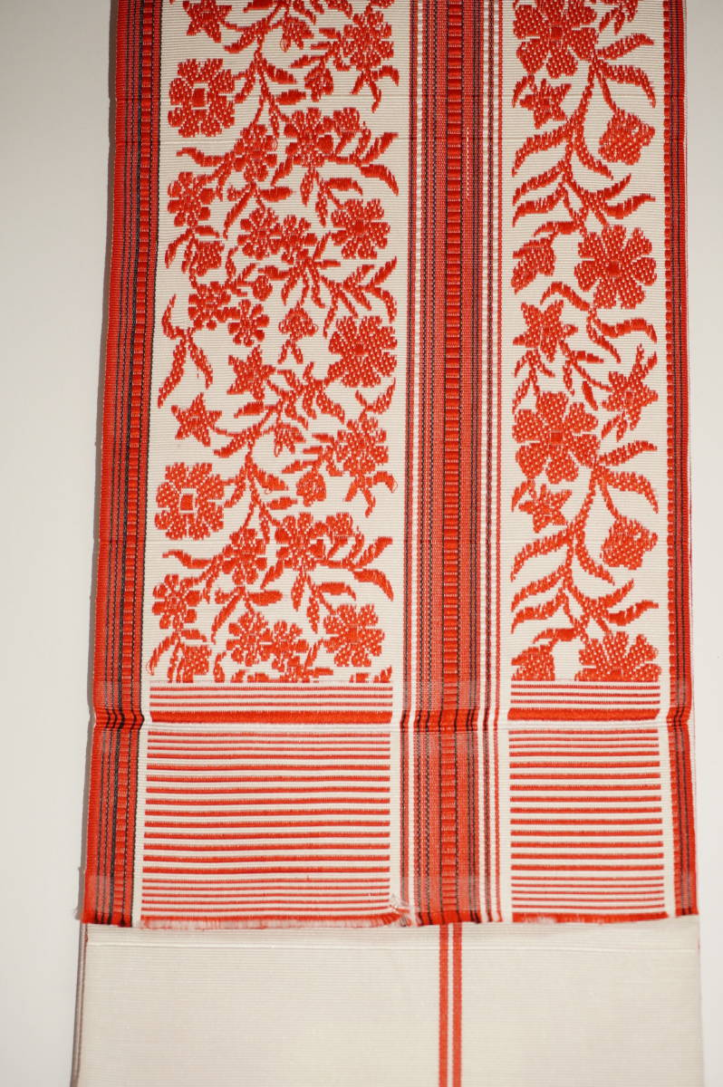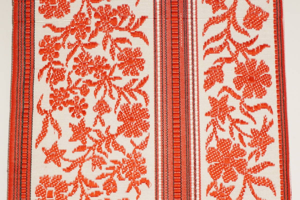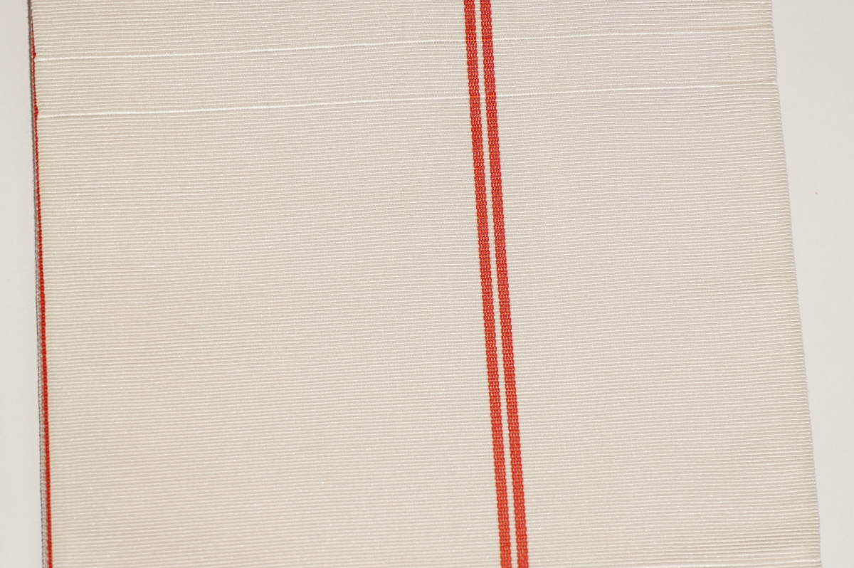 白クリーム地に赤色で柄、黒の細線、裏面は白クリーム地に赤の線