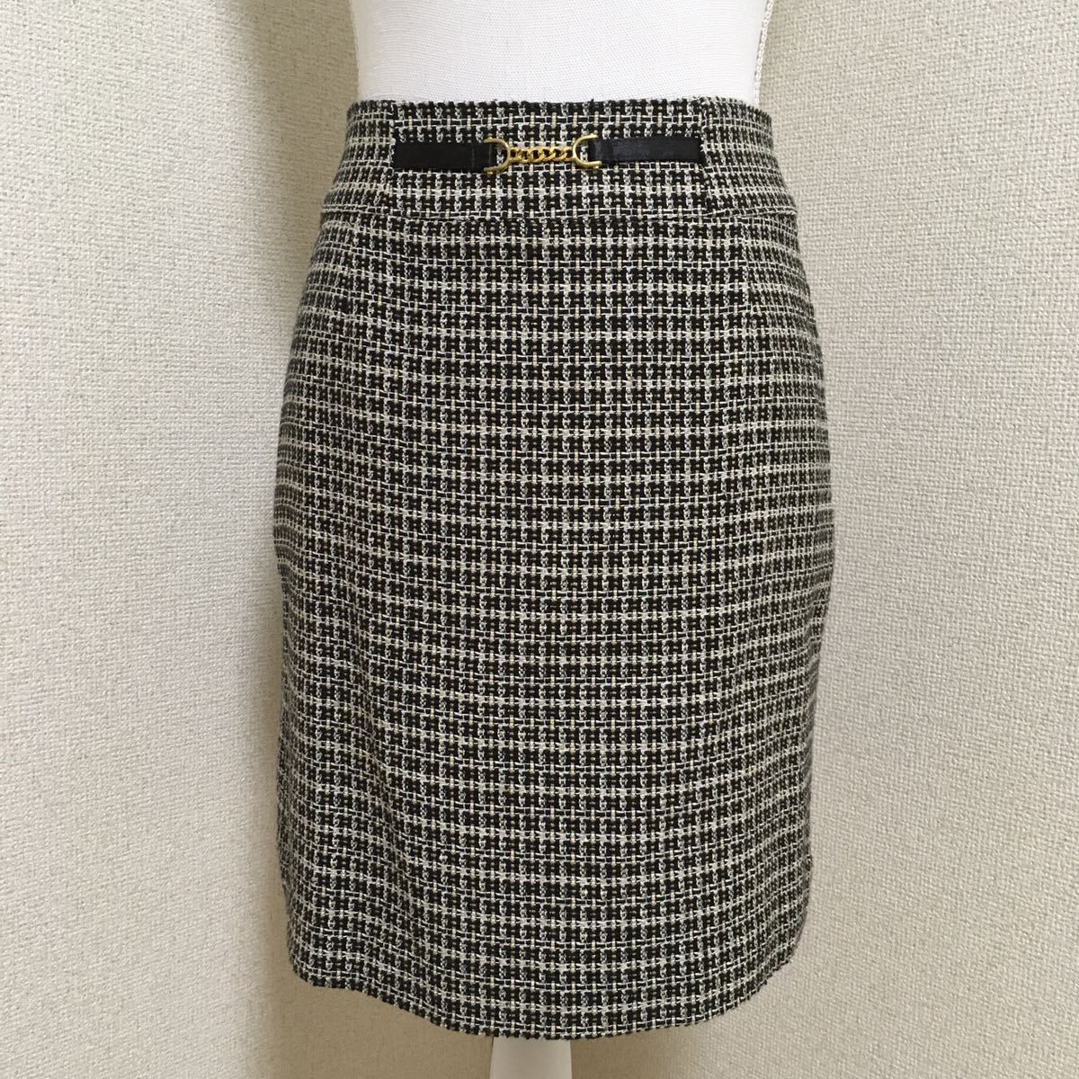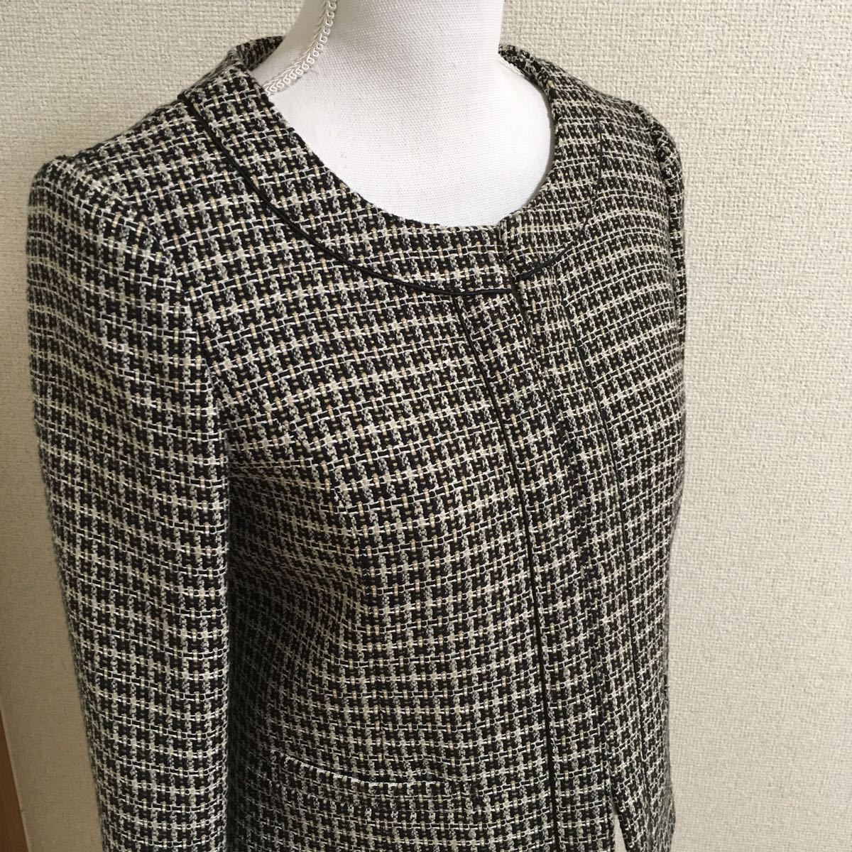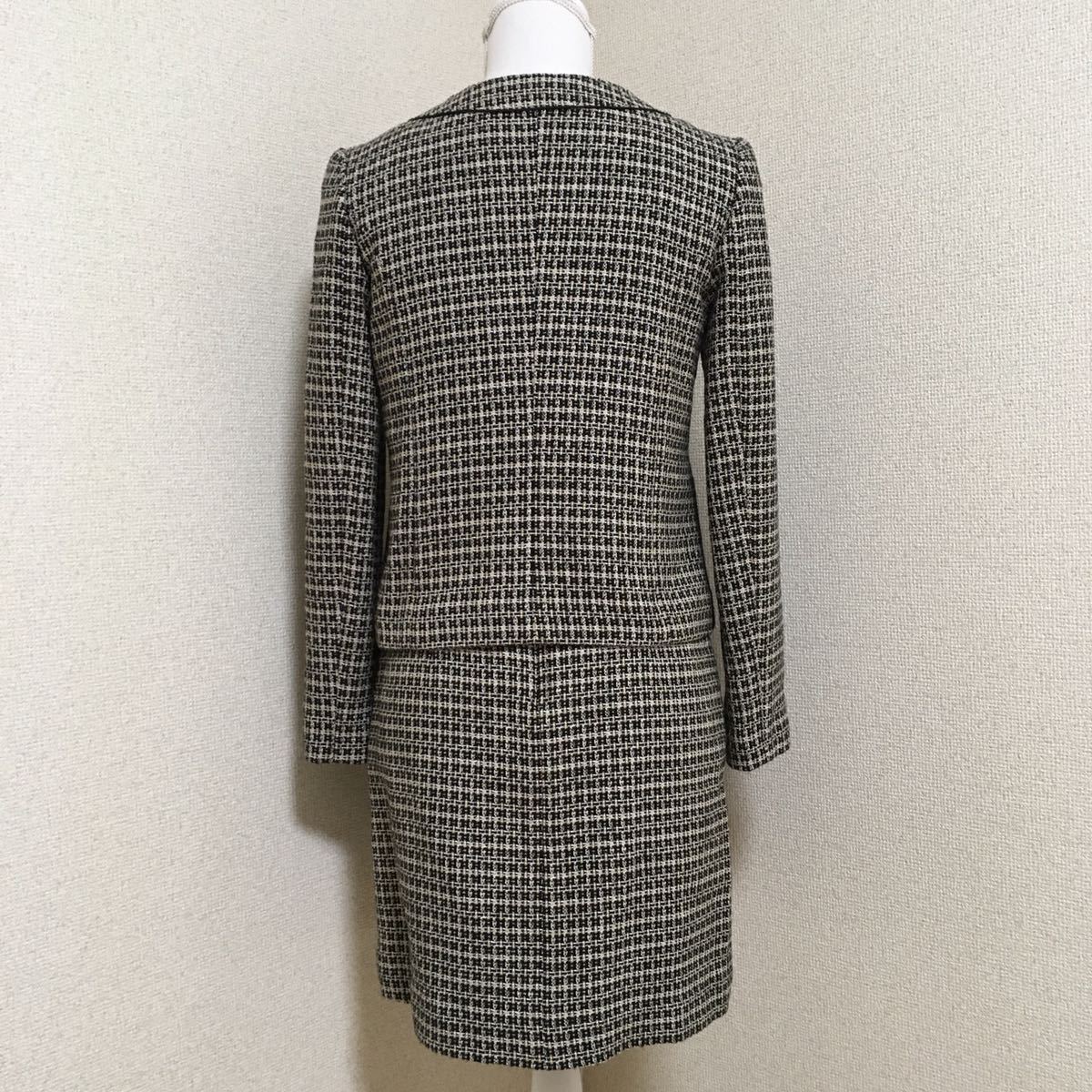 シミ、ほつれその他のダメージの見受けられないとても綺麗な状態のお品ですが、自分が使用していた物ではございませんので詳しい着用状況、購入時期は分かりません。秋冬用のツイード 生地で上着は総裏地仕立て、ホック5つで前を閉めるタイプ、ポケットウエスト部分2つです。スカートは総裏地、ファスナー後ろ中央開き、台形ライン、スリット無しです。ウエストのゴールドチェーンがおしゃれです。Used品でございます事をご理解頂ける方ご検討よろしくお願い致します。
