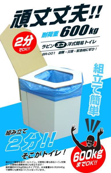組み立て2分でトイレができるラビンエコ洋式簡易トイレです。段ボール製なので頑丈、丈夫。耐荷重600kgです。