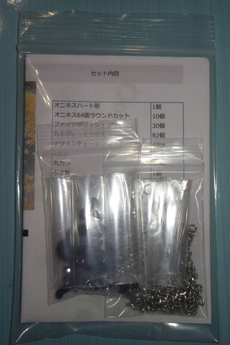 オニキスハート形1個とオニキスラウンドカット10個をつかいます。一度作ってますので、Tピンと丸カン、袋と小袋は新しいものです。レシピはホッチキス止めしてあります。天然石とガラス製品ですので、お取り扱いは丁寧にお願いいたします。基本的にノークレーム・ノーリターンでお願い致します。金属アレルギー、メッキ加工が肌に合わない方は注文をお控えください。ハンドメイド品ですので少々の色の濃淡、個体差などがあります。不明点はご質問ください。丸ペンチ、平ペンチ、ニッパーを別途ご用意ください。以上気になる方はご入札をお控えくださいませ。