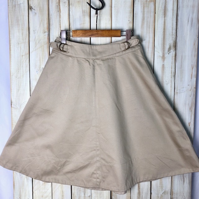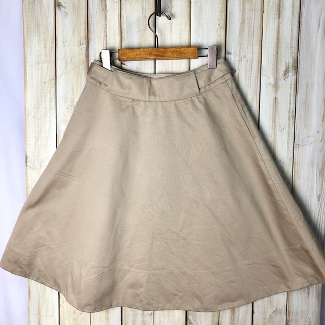 ●商品説明・・・VETEMENTS DE TRAVAIL DANS UNE BOUTIQUE IENA しっかりした肉厚なチノクロス(ツイルコットン)生地を使用したグルカスカートです。膝下丈で、ハリのある生地質としったり広がりのあるフレアシルエットで、ボリューム感のあるスカートです。本体部分の素材はコットンで、色はカーキベージュです。