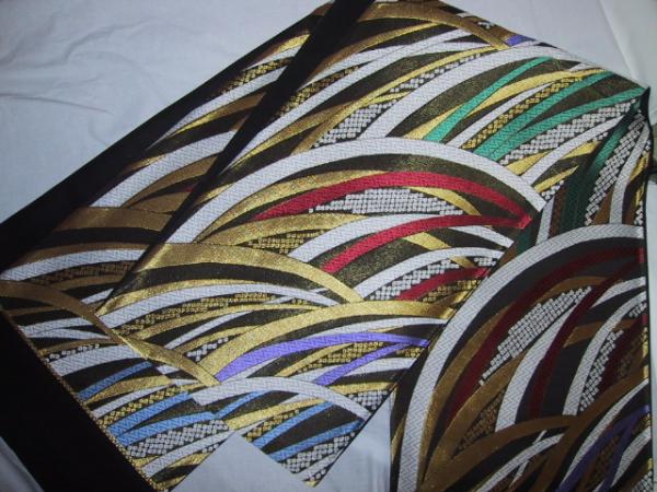 なお、帯柄左上に無地で出ているところは裏無地で、柄と柄の間に出ているところは手先と前太鼓のあいだの無地部分です。六通柄です。金銀糸が多用されているためストロボの照りで、しろぽく写っている部分があります。