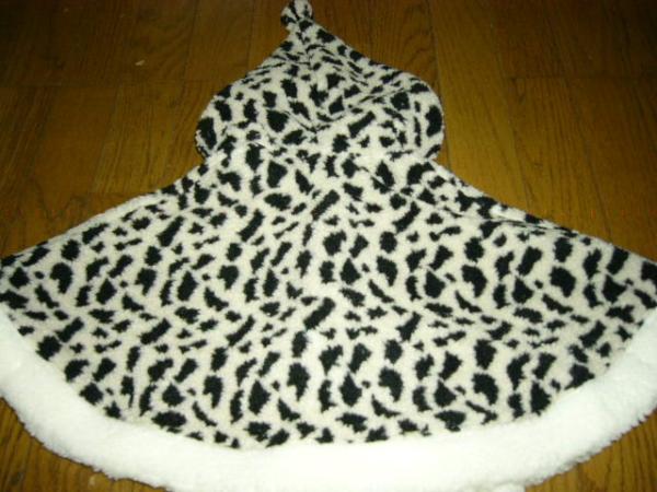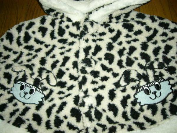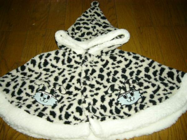 ※ 可愛いですわ。見た目も、とても暖かそうです。ぶちの模様が猫みたいだと思いました ※ (色) 白が縁取り、ベージュ系&黒のぶちの模様です (サイズ) 80cm (製造) 中国製 (素材) ポリエステル 100% (洗濯表示) 洗濯機OK (デザイン) 布地の厚さは、厚めの部類に入ると思います。埼玉だと真冬向きです。 フード付きです。フードは取り外しは出来ません。前側の真ん中は、ぼんぼんが付いていますが 内側には、スナップボタンが付いています。裾の上には、兎の模様?両サイドに可愛く 描かれています。裾の両端には、端から → 9cmの部分にスナップボタンが付いています。 女の子向きかな?と思いますが男女可で着られると思います。可愛いですよー。 三角の尖がり帽子も可愛いです。てっぺんに、ぼんぼん付きで、微笑ましいですね。 (状態) 未使用です。値段無しのタグ付きです。 (総丈、肩からの) 35cm (裾の横幅、片側) 71cm (肩のてっぺんから、裾までの端にそっての長さ) 37、5cm |