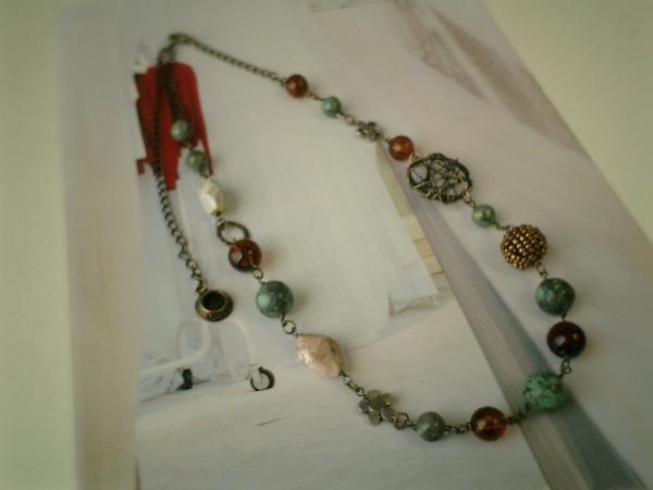 アンニュイ(?)な雰囲気のターコイズのネックレスを作りました♪パリ(??)っぽいアンティークな雰囲気で作りました。ターコイズは12ミリ、8ミリの丸玉で23ミリのワイヤーボールや8ミリ、10ミリの琥珀色の樹脂ビーズや15×10ミリ位のピカソジャスパーのラフカットや10ミリのお花のメタルビーズや14ミリのブロンズ色のビーズ玉をランダムにつないでいます♪♪シックなお色でまとめていますので大人っぽい可愛さです♪長さは全長65センチで調節自由です。飽きのこないいつまでも着けられるデザインを考えて作りました!お揃いのブレスレットも出品予定です♪ハンドメイドをご理解頂いてノークレーム、ノーリターンでお願いします