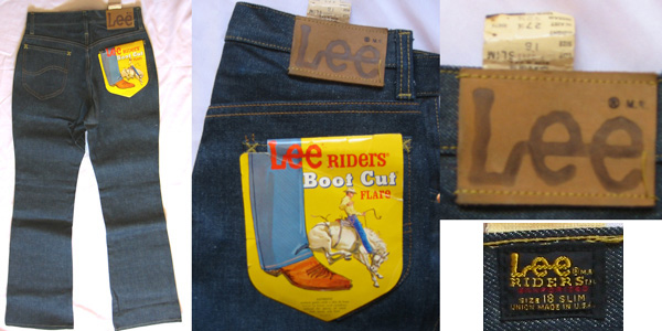 | 60年代または70年代初期のLee RIDERS, 20?-0341SLIMです。ジーンズ内側にサイズタグあります。タロン42ジッパー、ポケットのタグはLeeとTMのみです。 | |