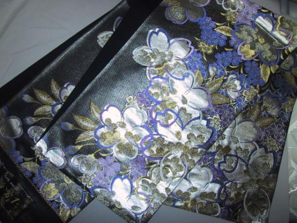 京都西陣 じゅらく の 若向きよう(振袖、訪問着、付け下げ、無地、小紋、など向き)のTOPブランド品『花かるた(花かおり)』ブランドです。6通柄袋帯 新品未仕立て品、絹100%金属糸等使用   くろ色のの生地に さくらさくら、、、