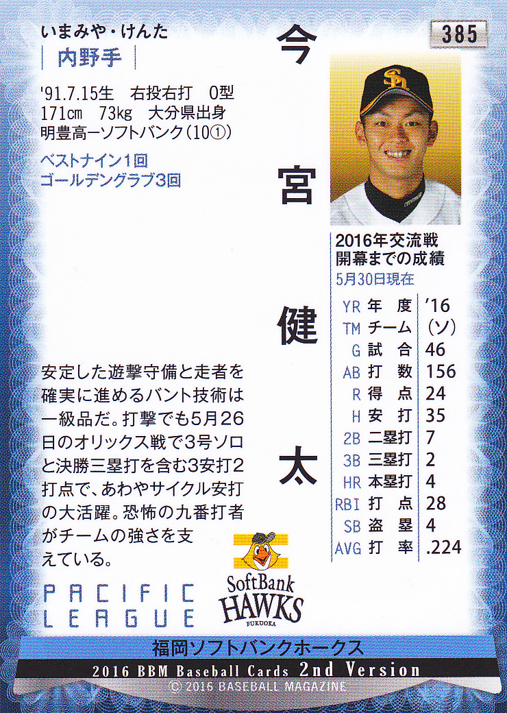 BBM2016ベースボールカード2nd 385 今宮健太 大分県 明豊高校 ドラフト1位 福岡ソフトバンクホークス