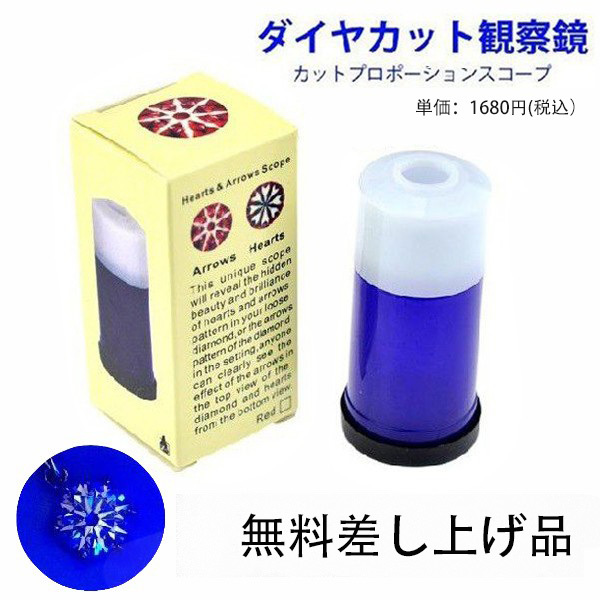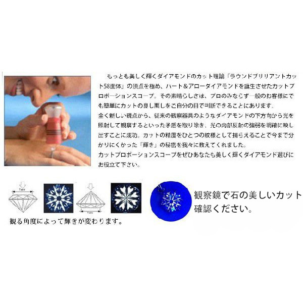 このダイヤモンドの最高なカートを観察できるため、無料でダイヤモンドカット観察鏡 (カットプロポーションスコープ \1500円)を同梱で送付いたします。 |