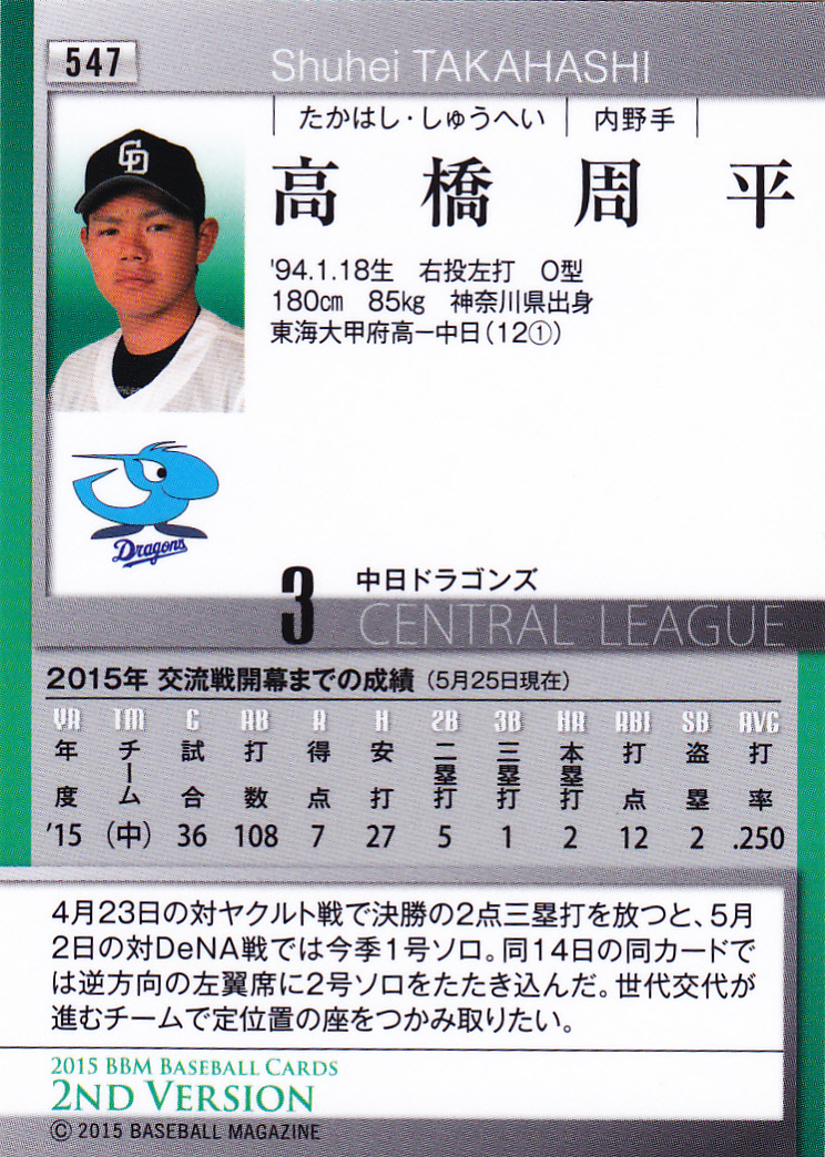 BBM2015ベースボールカード2nd 547 高橋周平 神奈川県 東海大甲府 東海大学附属甲府高校 ドラフト1位 中日ドラゴンズ