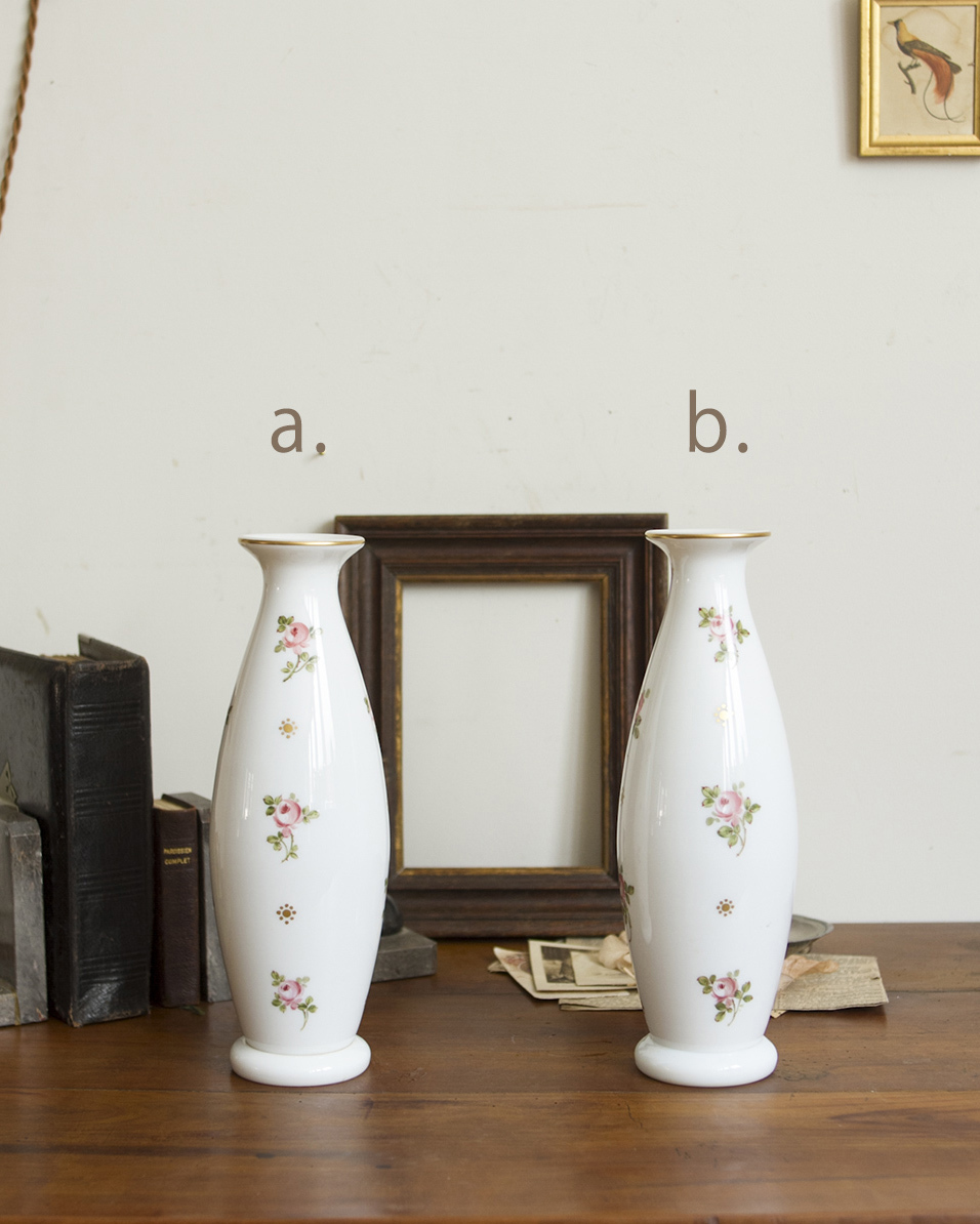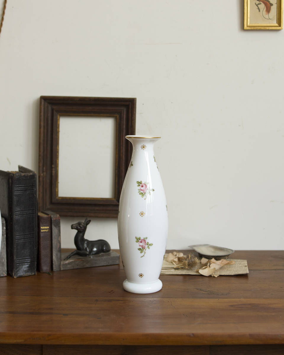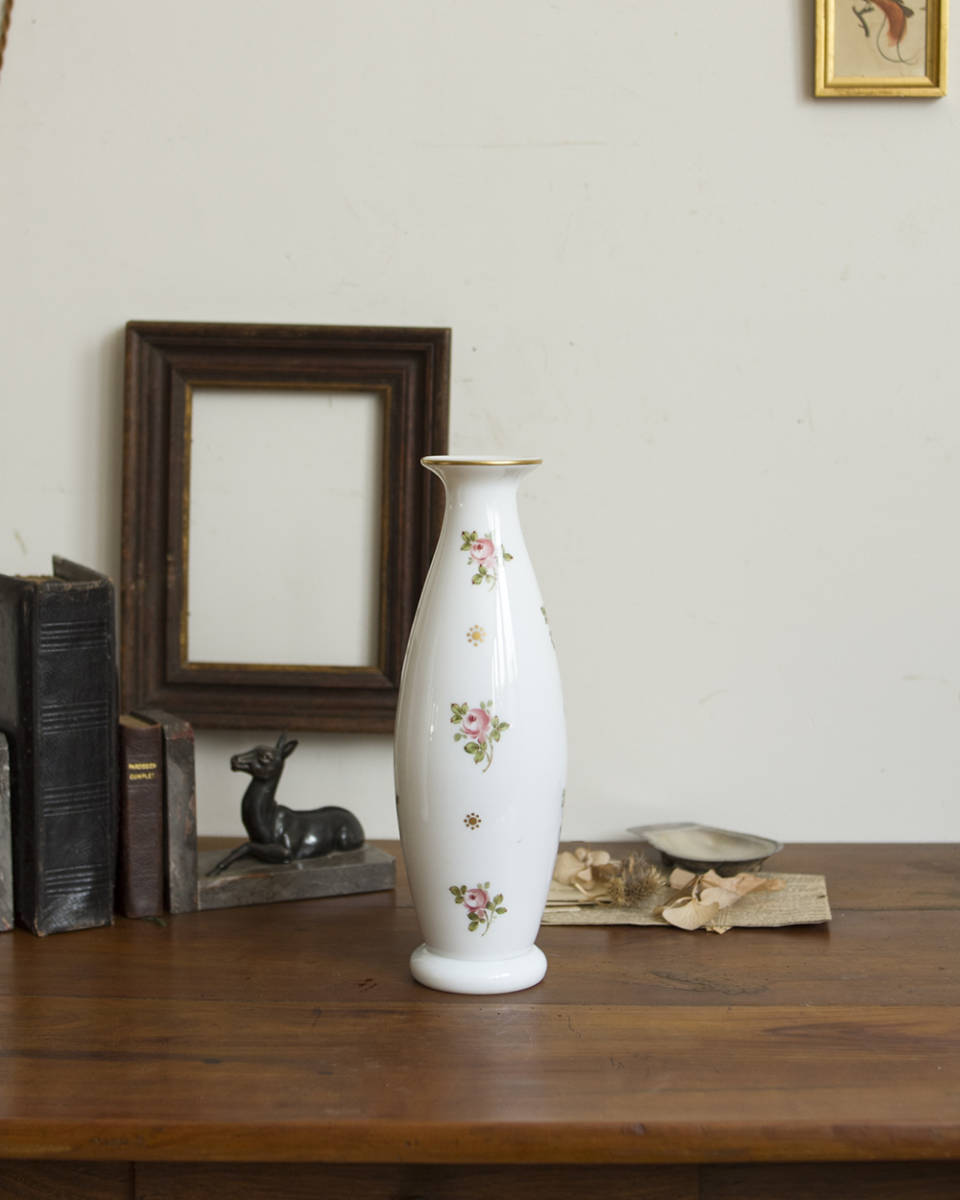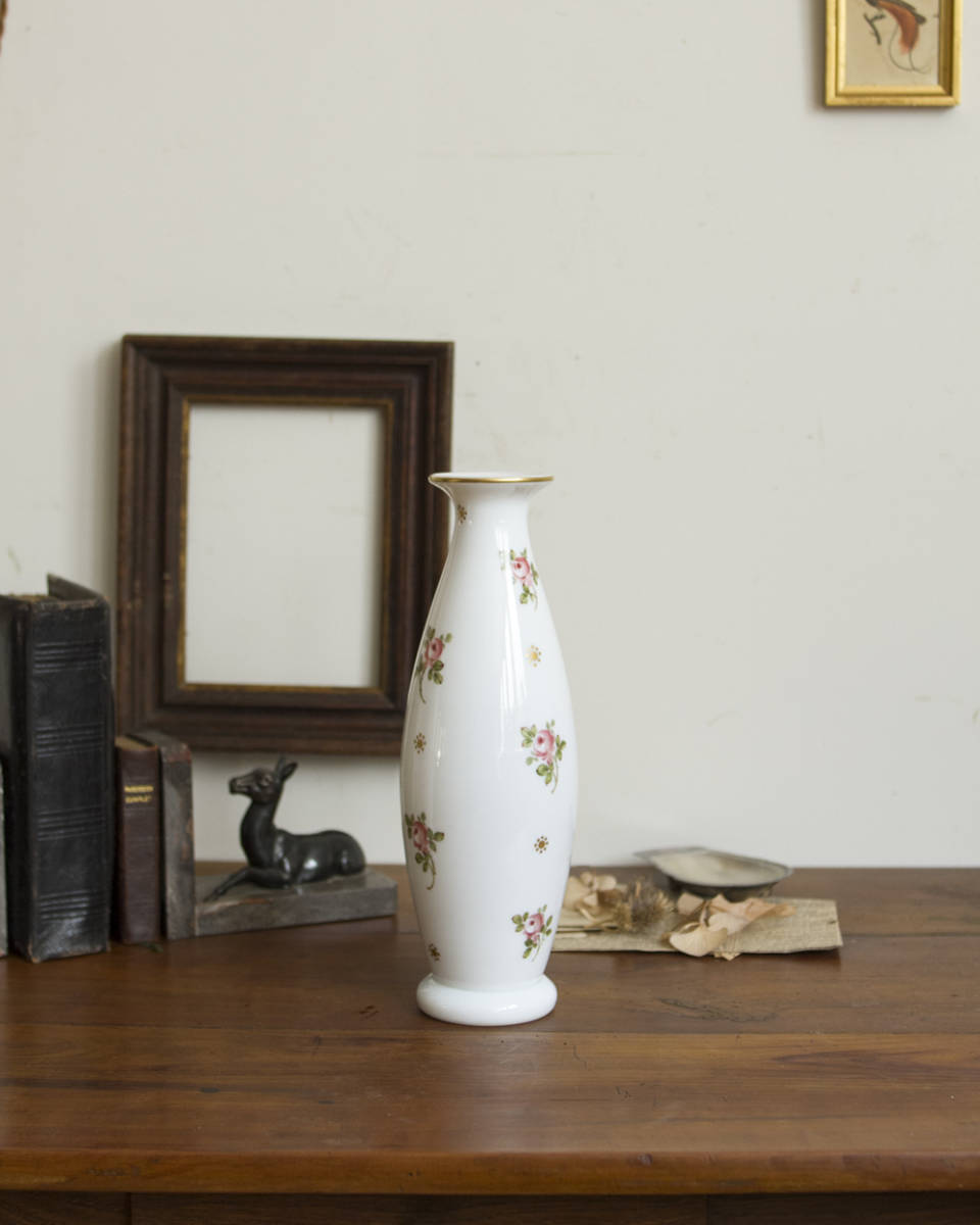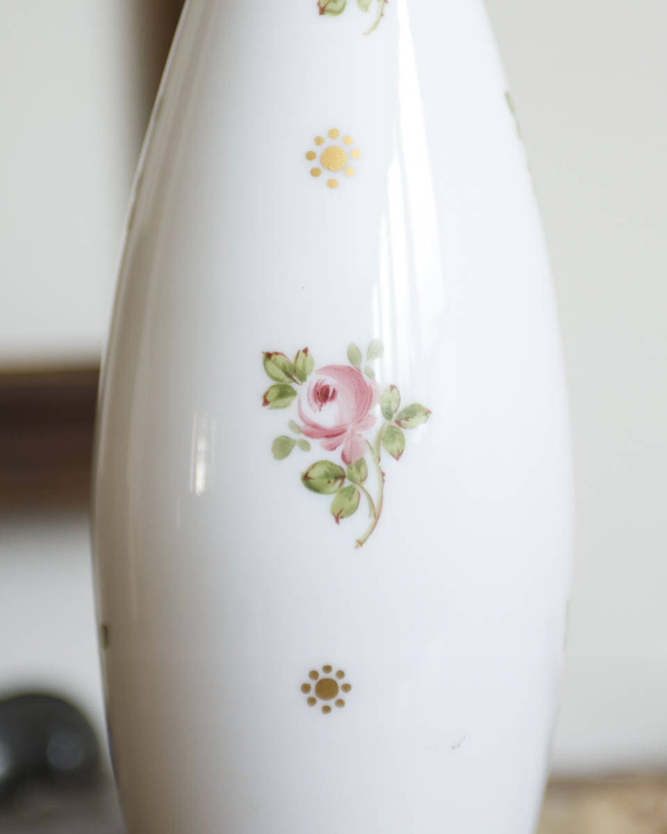 From : France バラの花模様が目を惹くフェミニンなデザインが 魅力的な陶器製のフラワーベース ベース全体に上品に散りばめられた、ころんとした バラ模様がとてもエレガントで美しく また、陶器ならではのしっとりと艶のある質感に 緩やかな曲線を描いたフォルムがより女性らしい 雰囲気を醸し出しており、どの角度から見ても うっとりしてしまうほど。 こちらは1点ずつの出品となります。 同じデザインで状態違いのものが1点ございます。 ひとつだけでも十分な存在感を放ちますが、 対で揃えて飾っていただくどより素敵な雰囲気がございます。 併せてご覧くださいませ。 アンティーク品のためシミや小さな傷、欠けや擦れなどがある 場合がございます。アンティーク特有の風合いとして お楽しみくださいませ。