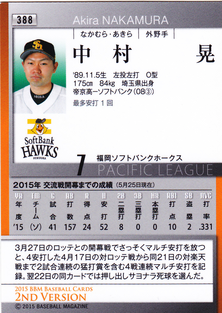 BBM2015ベースボールカード2nd 388 中村晃 埼玉県 帝京高校 福岡ソフトバンクホークス
