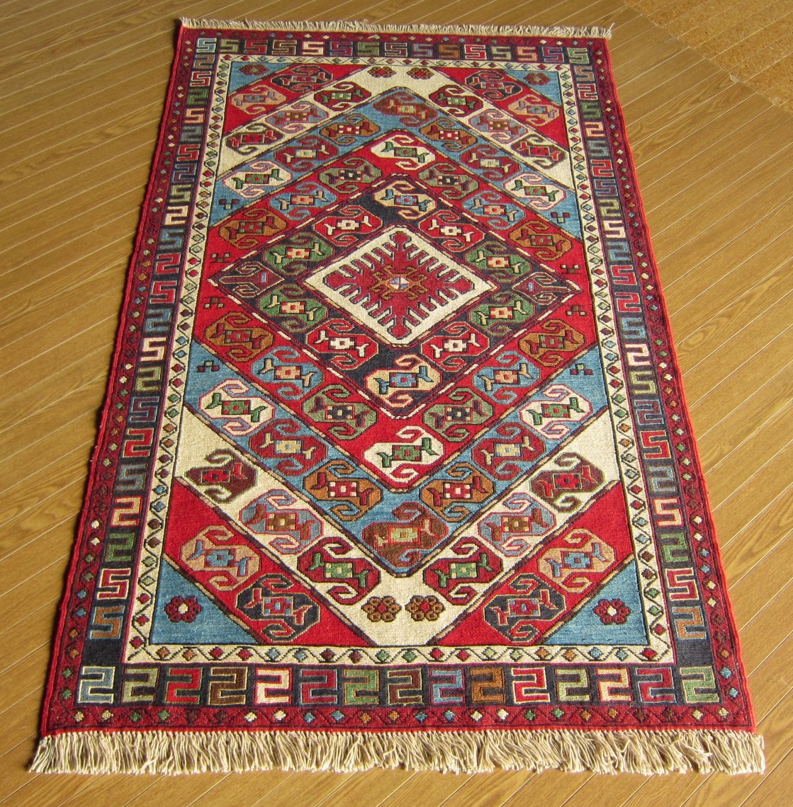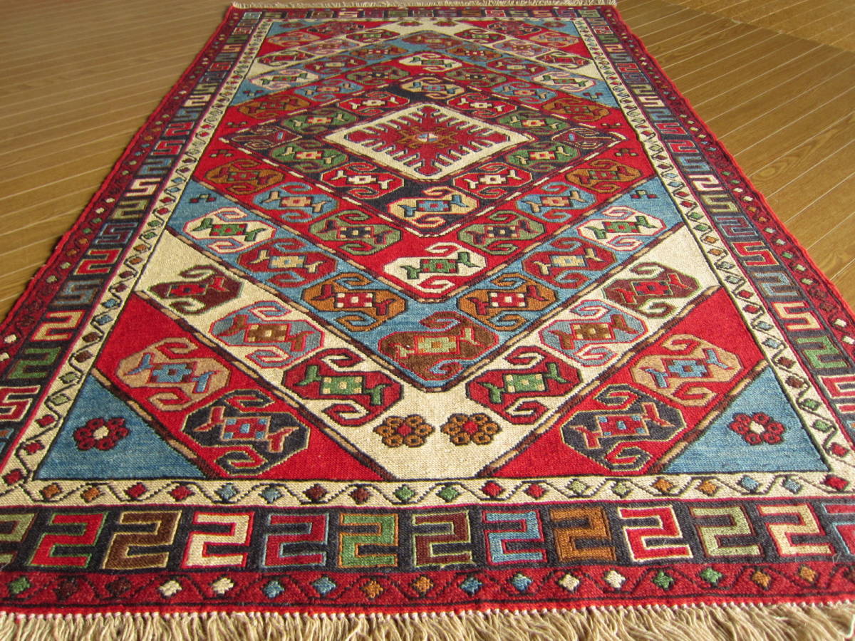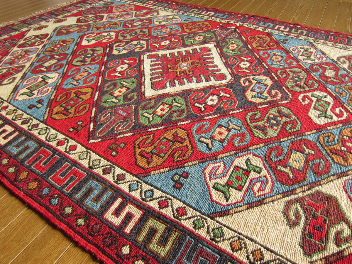 商品説明 | ★素材 : ウール・手織り・スマック織り ※スマック織りとは、イランのキリムの織り方の技法です。 土台の縦糸と横糸の上にもう一本横糸を絡めるように 巻き込んで織っていく高度なテクニックで、 刺繍のように細かな文様を描けることができます。 スマック織りは裏面に模様の糸を渡してあるので 片面使いのキリムになります。 ★サイズ : 約 152×98 cm (房を含まない長さです) ★産地 : イラン・アゼルバイジャン ★状態 : 新品 kxpgs342+ZIBACARPET絨毯 kxpgs342+ZIBACARPET取扱いペルシャ絨毯 FARSHEZIBA_KILIMキリム |