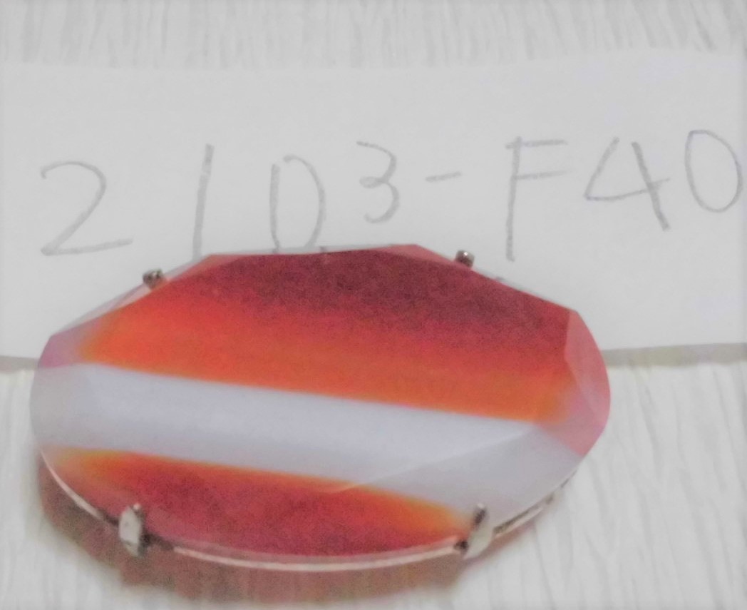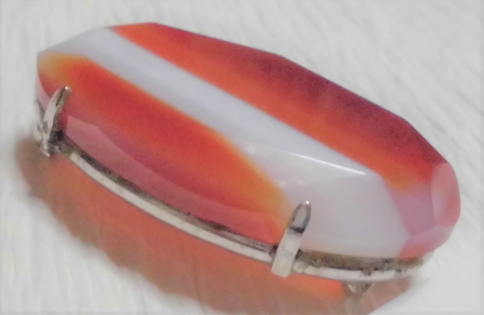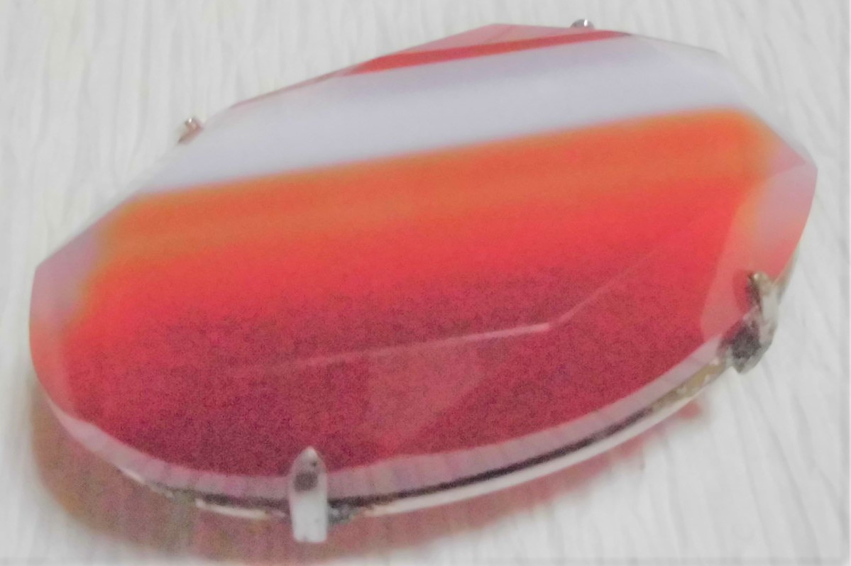 きれいにカットされたレンガ色と白の縞瑪瑙の帯留めです。