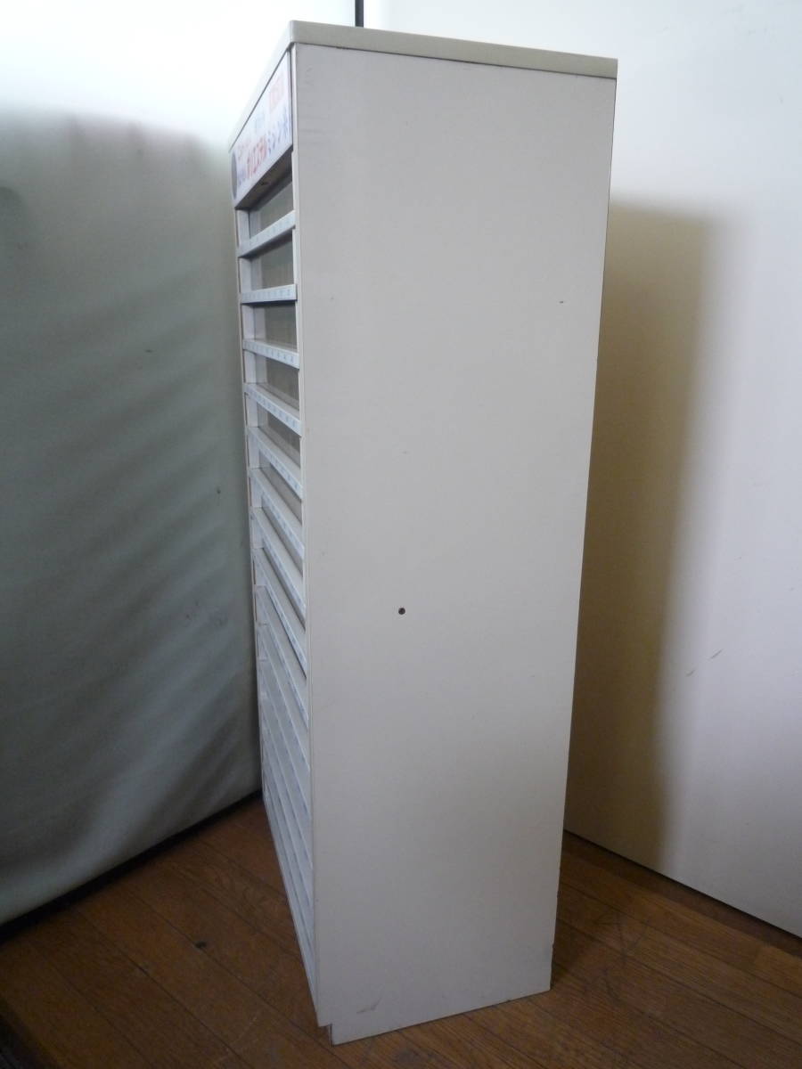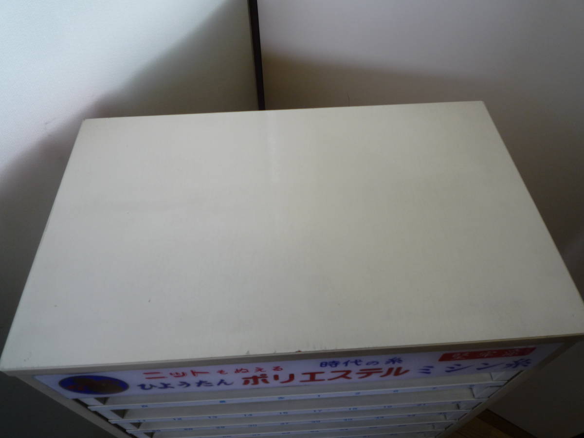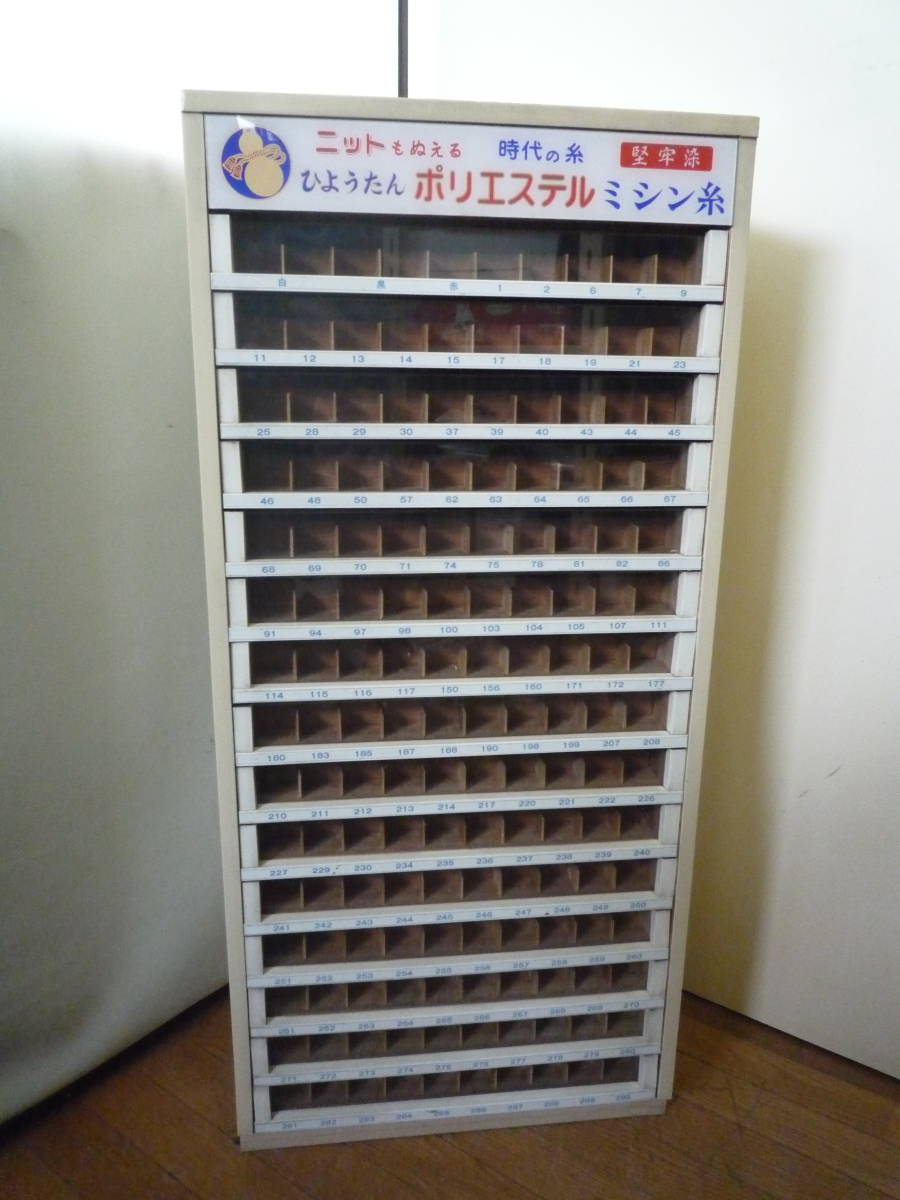 | 業務で使われていた古い販売店用陳列ケースです。 一般的に販売されていない物なので入手は難しいかと思います。 当時物ですが、かなり良い状態を保っているかと思います。 サイズはおおよそとなりますが、幅 41㎝ 奥行 26㎝ 高さ 89㎝ となります。 一番上が収納ケース1段で収納スペースは18.5㎝×35㎝ 高さ5.5㎝となります。 それ以降の下段ミシン糸収納前面1マスは3.5㎝×3.5㎝となります。 前面の見える部分のクリアー部分はガラスとなります。 絹カード巻きの収納ケースにも良いですが、チョロQやミニカー、小物の収納ケースにもいかがでしょうか? |