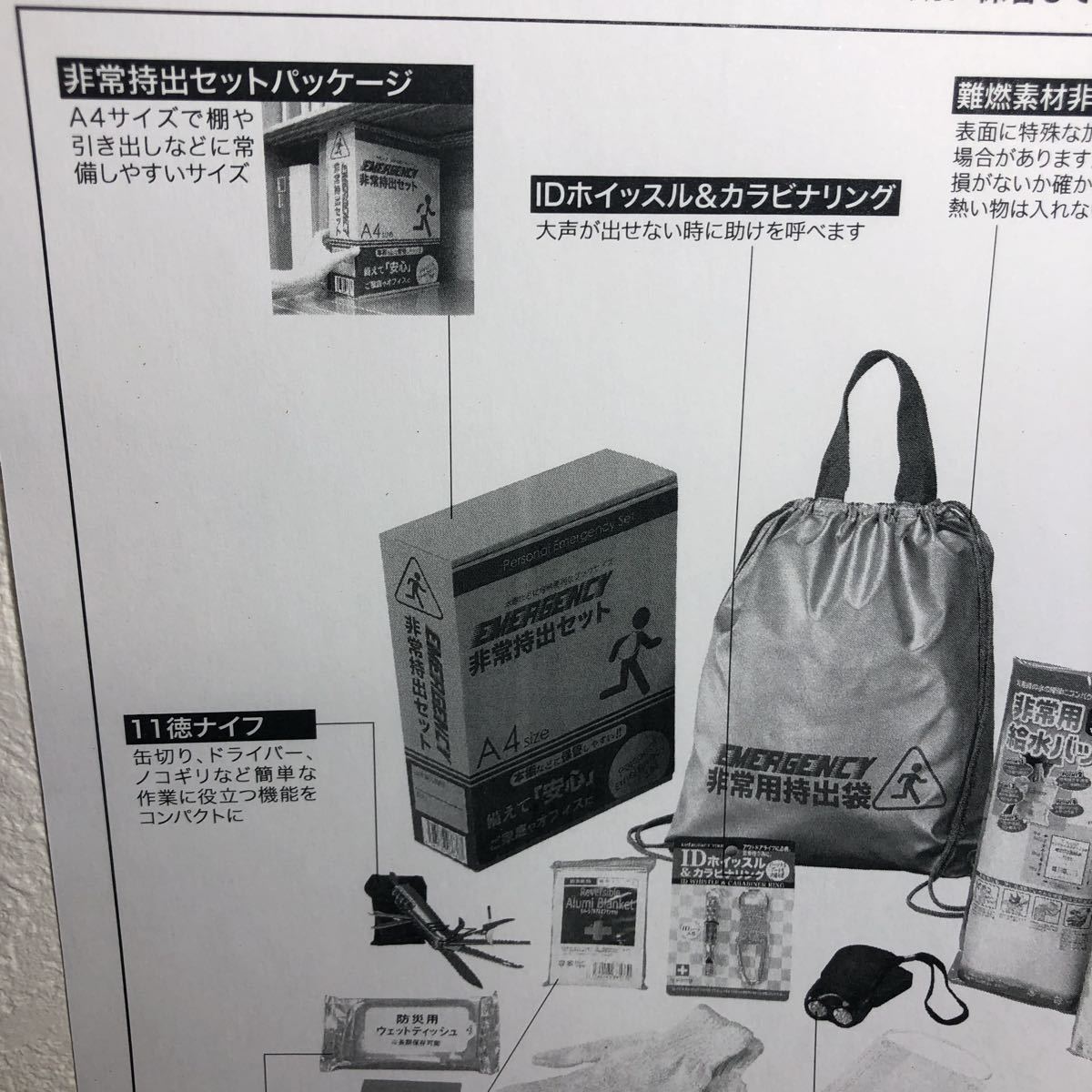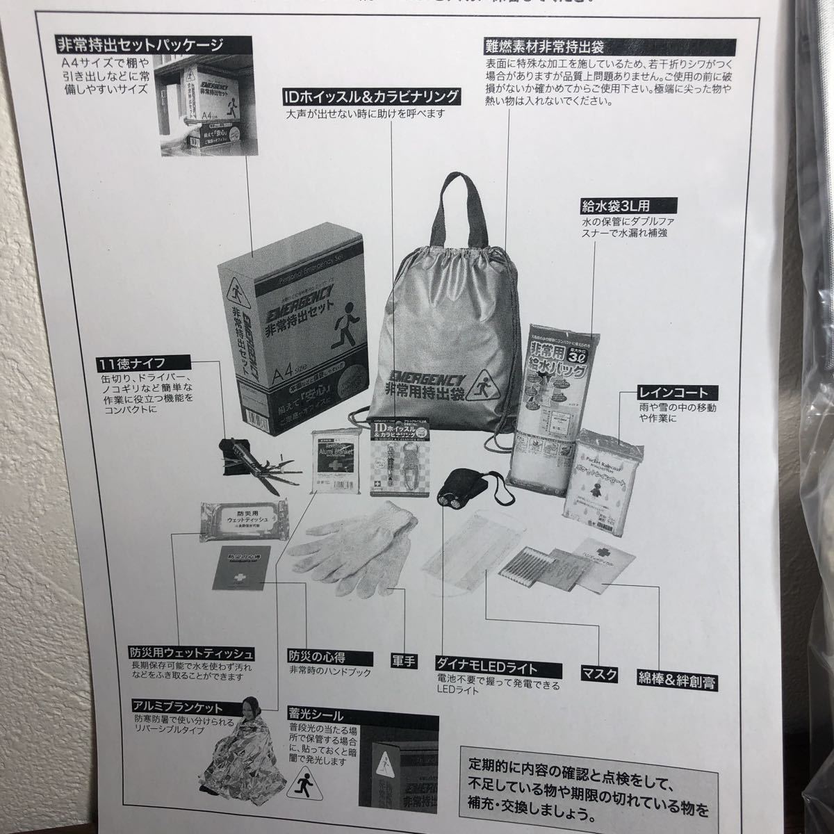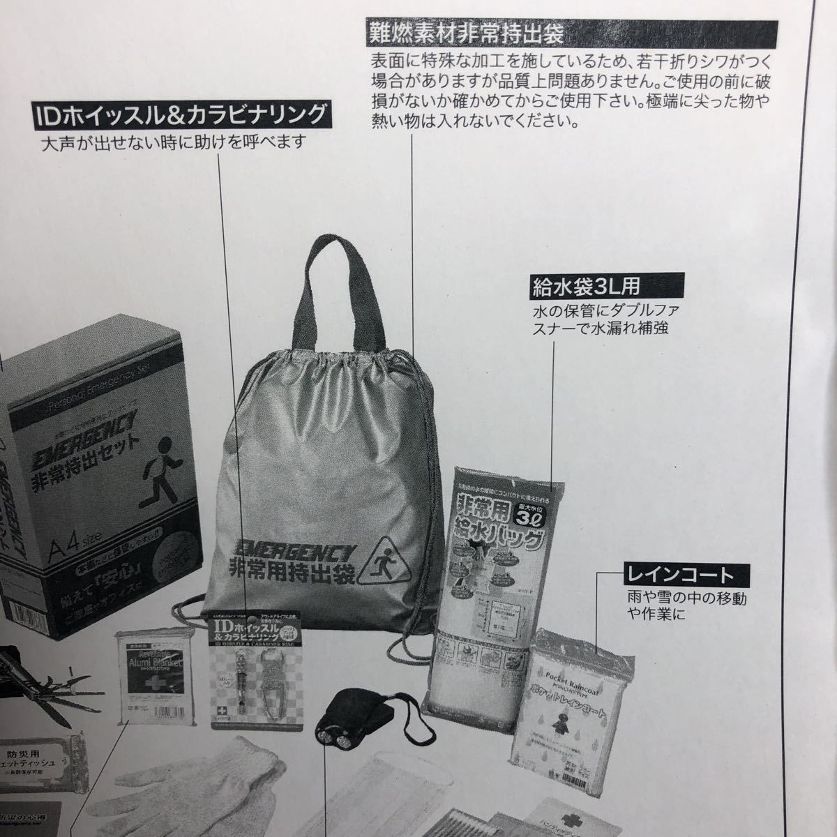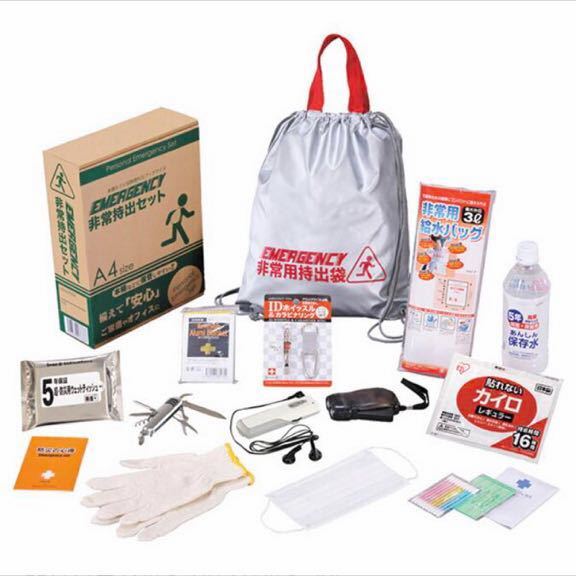 ■内容:非常持出袋(約335×390mm)×1、アルミブランケット・IDホイッスル&カラビナリング・8徳ナイフ・ダイナモLEDライト・FMラジオ(約19×112×35mm)・5年保存水(約500ml)・給水袋3L用・マスク・軍手・綿棒&絆創膏・カイロ・防災の心得・防災用ウェットティッシュ×各1