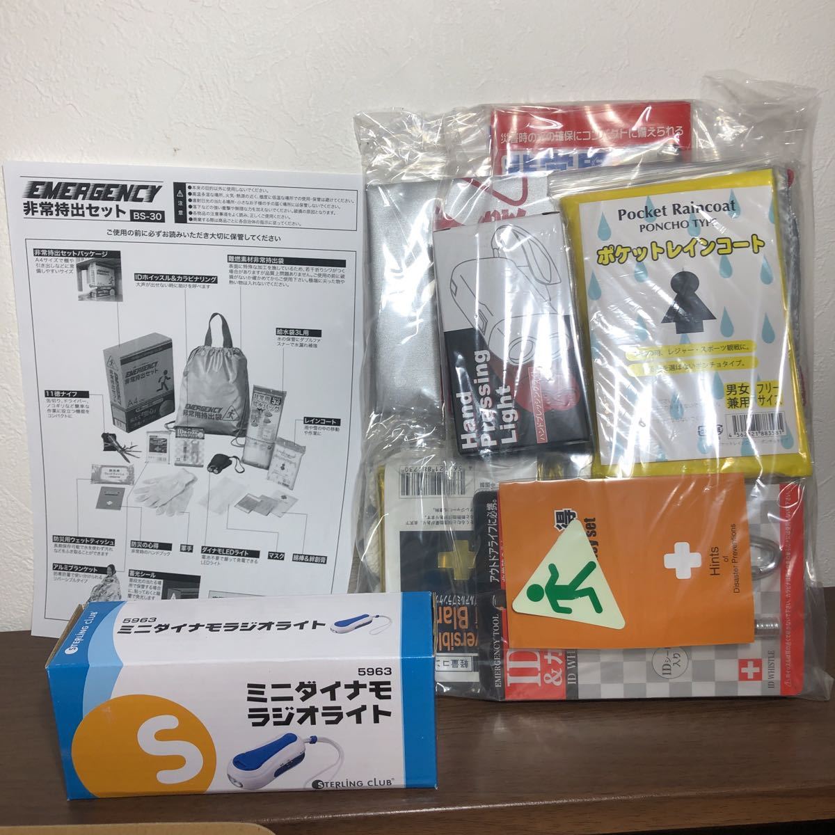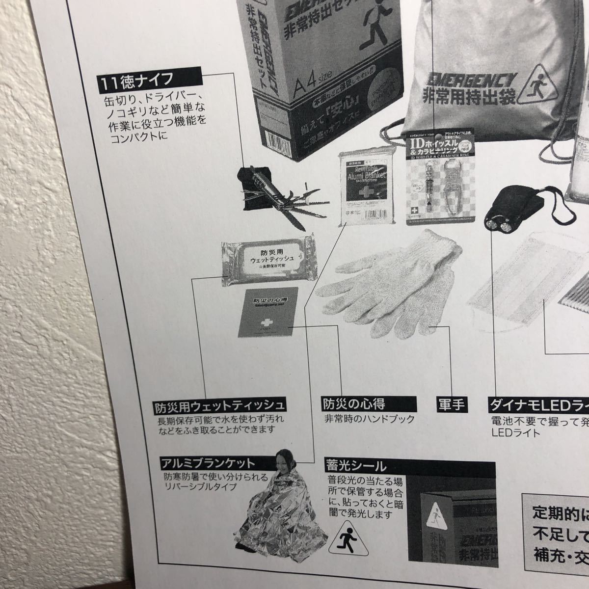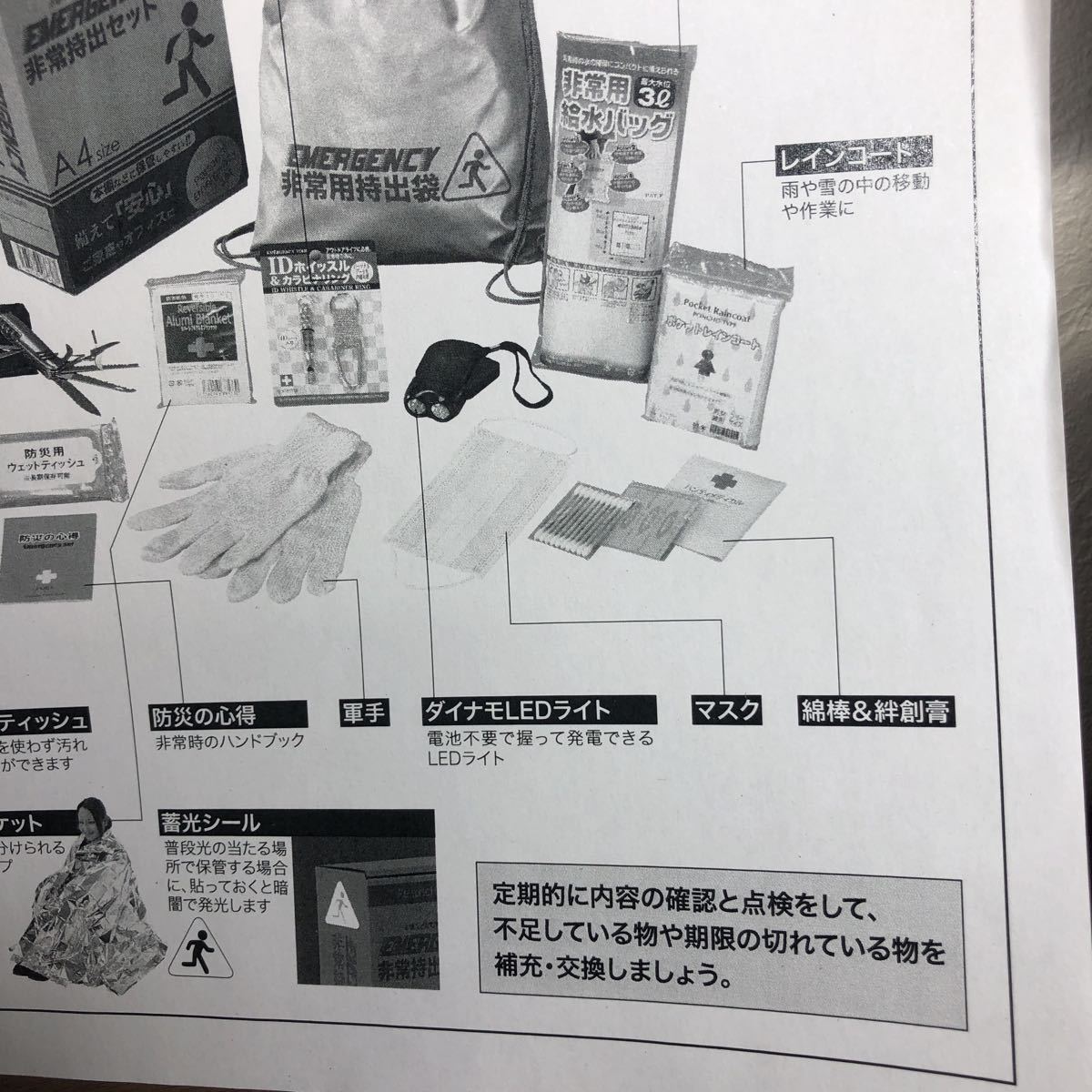 ■内容:非常持出袋(約335×390mm)×1、アルミブランケット・IDホイッスル&カラビナリング・8徳ナイフ・ダイナモLEDライト・FMラジオ(約19×112×35mm)・5年保存水(約500ml)・給水袋3L用・マスク・軍手・綿棒&絆創膏・カイロ・防災の心得・防災用ウェットティッシュ×各1