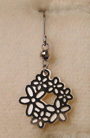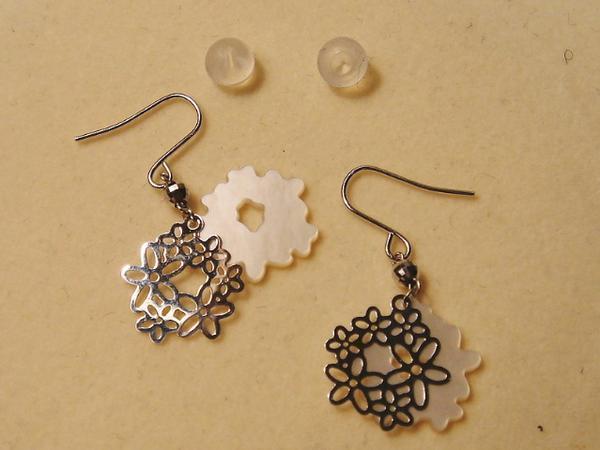 6輪の花のデザインを薄いK18WGの板で打ち抜き、その後ろには同じシルエットの白蝶貝の板がセットされています。