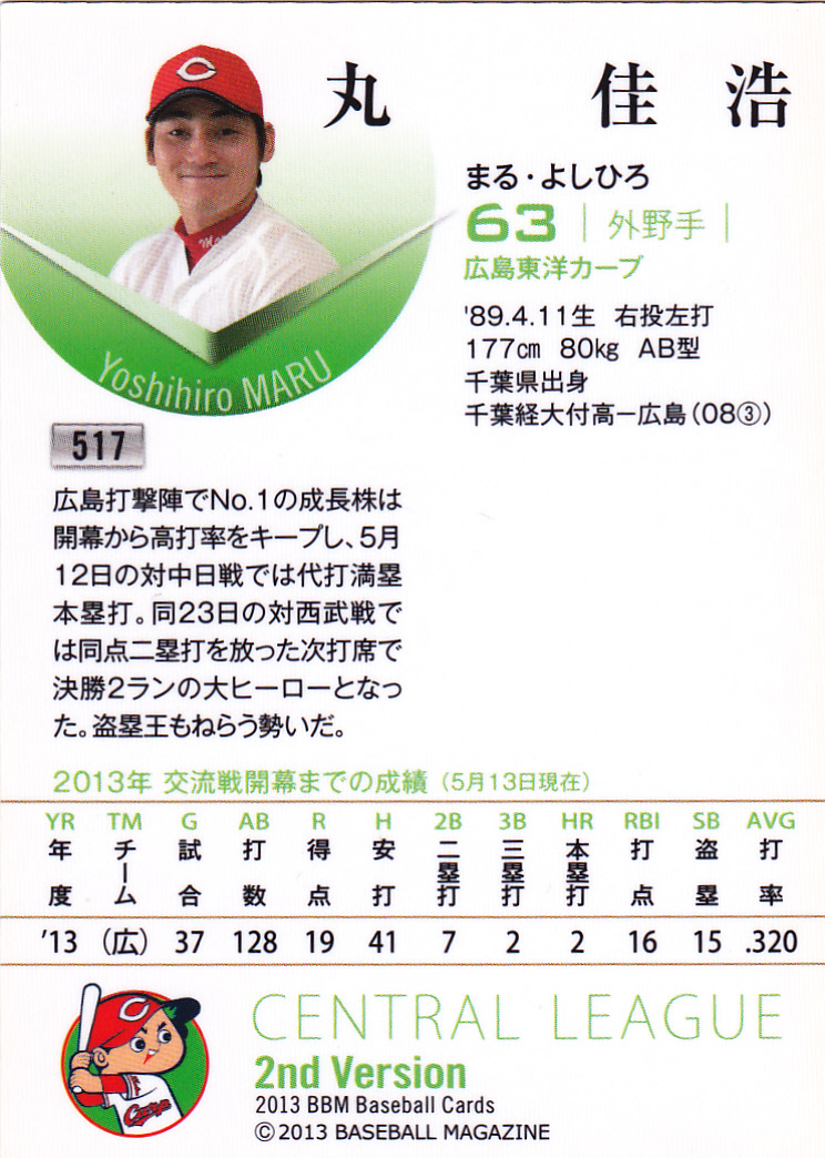 BBM2013ベースボールカード2nd 517 丸佳浩 千葉県 千葉経済附属高校 広島東洋カープ 千葉経済大学附属高校