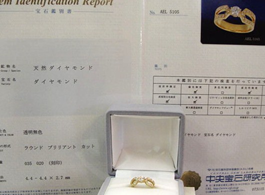 *中央宝石研究所の鑑別書付き。(ダイヤが枠に留められていて、ダイヤのグレード表示のある鑑定書は取れませんが、本物のダイヤで有るという、鑑別書付きですのでご安心下さい。ルーペで見る所、Hカラー・SI1クラリティ・GOODカット位でしょうか。)