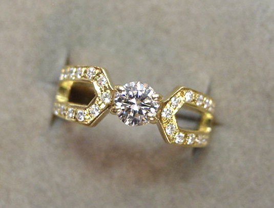 ♪【K18】製、ファッションリング枠の中央に【天然ダイヤモンド:0.35c】1個を留め、その両側にも、【天然ダイヤモンド:0.20c】を埋め込み留めし、主石を引き立てています。腰の低い、指に着け易い造り、デザインですので、ファッション・お洋服・場所・時間を問わず、楽しめます。ファッションリングとして、また、一味違う【婚約指輪】にもお使い頂けます。プレゼントにも最適です。