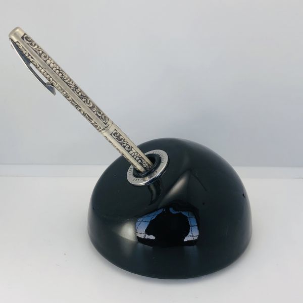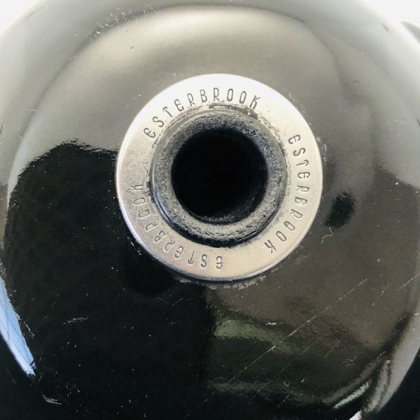 年代 :1950's前後辺り サイズ :高さ 5cm x 直径 8.5cm x 口直径 1.3cm 素材 :ポースレン (磁器) 重さ :約 364g 色 :黒 製造会社 :ESTERBROOK 製造国 :アメリカ ペンは付属しません アメリカで買い付けたESTER BROOK社のペンホルダーになります。 アメリカでも人気の高いメーカーでスタイリッシュなデザインが特徴です。 ペーパーウエイトとしてもお使い頂けます。 画像ではバックの背景が反射してわかりずらいですがワレやヒビなどは無く破損はありません。 裏のフェルトの剥がれが目立ちますが見えない場所なので使用には問題ないかと思います。 出品している全ての商品は古いもですので細かいキズや使用感等ありますので アンティーク品として理解頂ける方のみ購入下さい。 (破損や目立つキズがある場合は詳細に書いております) 他にも世界のアンティーク雑貨等、多数出品しておりますので宜しければ マイオークションからご覧ください ↓↓↓ ![]() サイズは出来る限り正確に測っておりますが、多少の誤差はご了承ください。 写真をしっかりとご確認の上、入札して下さい。 (神経質な方はご遠慮下さい) 質問などありましたらお気軽に問い合わせ下さい。 尚、細かい写真など詳細をご希望の方は拡大写真を送りますので、質問欄にご希望の旨とメールアドレスをお載せ下さい。 (ご質問内容は公開される事はございません。ご安心下さい) | |||