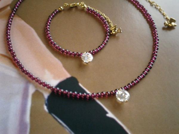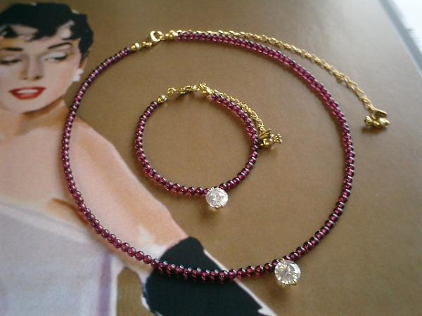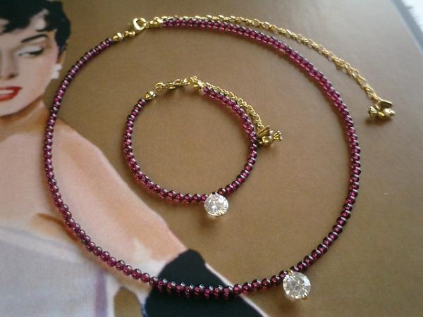 パリの恋人シリーズです♪深い赤のガーネットとジルコニアのネックレスとブレスレットのセットです!パリをイメージして作りました♪アンティークな雰囲気で可愛いです♪シンプルで飽きのこないいつまでも着けられるデザインを考えて作りました!深い赤なので長く着けて頂けると思います♪ガーネットは3ミリの丸玉でトップのジルコニアは8ミリです♪♪長さは37センチ+アジャスター14センチで最長51センチ位です。チョーカー風にも着けても可愛いです♪ブレスレットは16センチ+アジャスター5センチで最長21センチ位です♪同じシリーズも出品しています♪ハンドメイドをご理解頂いてノークレーム、ノーリターンでお願いします