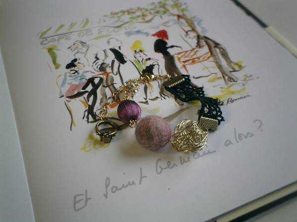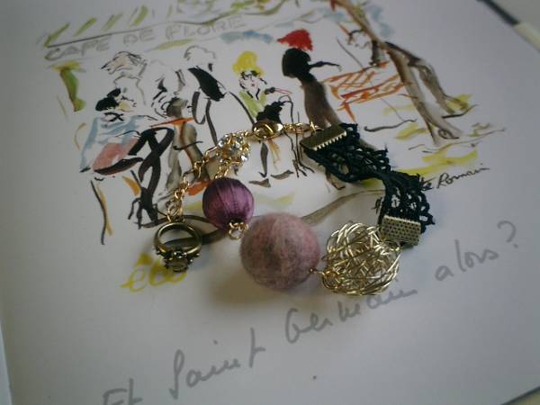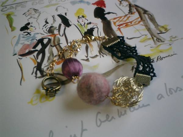 秋のクローゼットシリーズです♪大人の可愛らしさをイメージして!キュートな異素材のブレスレットです♪12ミリ位のパープルのサテンボールやベージュピンクのフェルト玉や20ミリのワイヤーボールや10ミリのジルコニア玉を合わせて黒の綿レースをアクセントにモダンにロマンチックしています♪長さは全長23センチ位で調節自由です♪甘すぎない大人の表情です♪お揃いのネックレスや同じシリーズも出品しています♪シンプルで飽きのこないいつまでも着けられるデザインを考えて作りました!ハンドメイドをご理解頂いてノークレーム、ノーリターンでお願いします