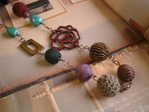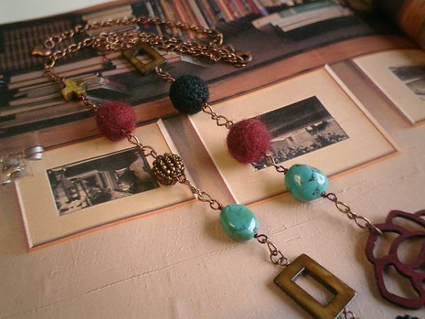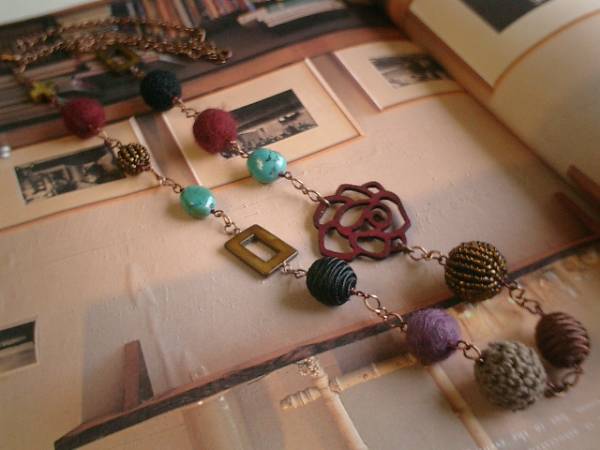 秋の薔薇シリーズです♪素材違いの薔薇を集めたデザイン違いのネックレスのシリーズです♪シックなターコイズやフェルト玉を集めてブラウン系でまとめました♪大人色のネックレスです♪ターコイズは13ミリから16ミリ位のタンブルです♪10ミリから18ミリ位までの大きさ違いのフェルト玉やサテンボールやシェルリングに35ミリのウッドの透かし薔薇を合わせてひっそりロマンチックしています♪長さは全長90センチ位で調節自由です♪同じシリーズも出品しています♪シンプルで飽きのこないいつまでも着けられるデザインを考えて作りました!ハンドメイドをご理解頂いてノークレーム、ノーリターンでお願いします
