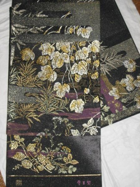 格調高い訪問着にどうぞ!帯です。おもに訪問着用帯です じゅらく 『帝王紫』ブランド 西陣3通柄帯 絹100%金属糸等使用   新品み仕立て品 こい灰x金らめ地(裏地はこい灰x金ラメ)期間限定で芯仕立てサービスの場合の期間もあります