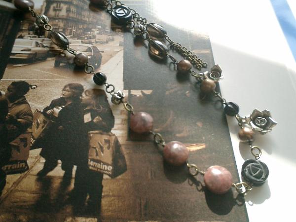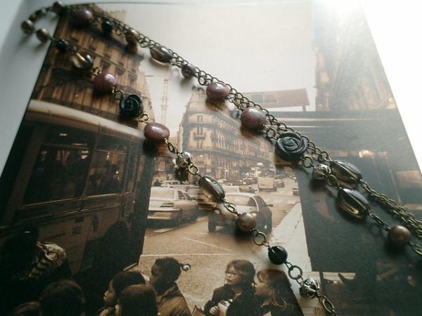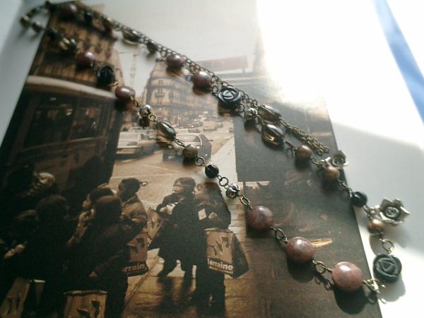 巴里・ミッシェルシリーズです♪大人の石を集めて物憂げな表情のネックレスを作りました♪スモーキークォーツは12×8ミリ位のオーバル、ロードナイトは10ミリのコイン、オニキスは10ミリ、12ミリの両面薔薇、6ミリのSライン、淡水パールは6ミリ位のポテト、お花模様のカレンシルバーや小さな薔薇のカレンシルバーを合わせてひっそりロマンチックしています♪巴里の下町をイメージして作りました♪繊細で可憐な雰囲気です♪♪長さは全長72センチ位で調節自由です♪チョーカー風にしたり、巻きつけてブレスレットにしても可愛いです♪お揃いのブレスレットも出品しています♪ハンドメイドをご理解頂いてノークレーム、ノーリターンでお願いします!