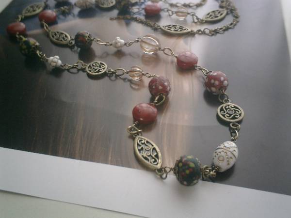 イノセント・ガール・・シリーズです♪巴里の帽子屋さん・・スポンジ珊瑚のキュートなネックレスです♪12ミリのコインのスポンジ珊瑚に小花柄や水玉柄のとんぼ玉やアンティークビーズやチェコビーズやデザインチャームを合わせてアンティークモダンな表情です♪長さは全長105センチ位で調節自由です♪2連にされても可愛いです♪お揃いのネックレスやブレスレットも出品しています♪シンプルで長く着けていただけるデザインを考えて作りました♪ハンドメイドをご理解頂いてノークレーム、ノーリターンでお願いします